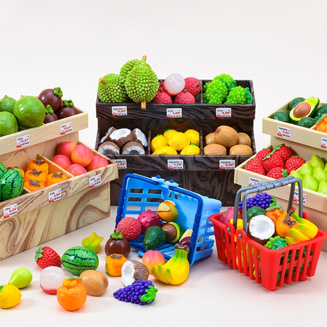 Usage Scenarios: .Miniature kitchen/supermarket scene setup .Role-playing games .Creative crafts and collection display .School teaching props and storyboard makingSpecifications: .Material: Plastic + Resin .Product Weight: 450g .Package Weight: 450g .Product Dimensions: 12 x 7 x 8cm .Package Dimensions: 21.5 x 11 x 15cm .Packing: Box .Age: 16+Package Including.Fruit Rack .60-70 Fruit Items.Fruit Baskets *2