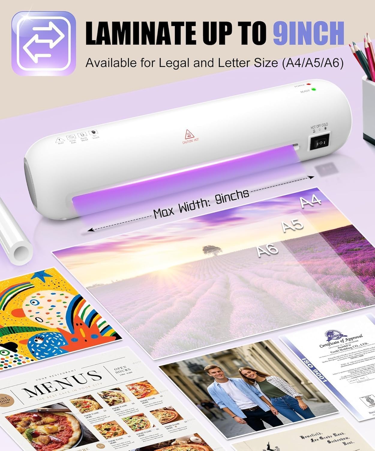 A4 Laminator Machine,9 Inch Small Laminating Machine,Thermal Laminator Dual Hot & Cold Modes for A4 Paper & Photos, 60s Warm-Up,ABS Jam-Release,Quiet Operation,Portable for Office School Home,White