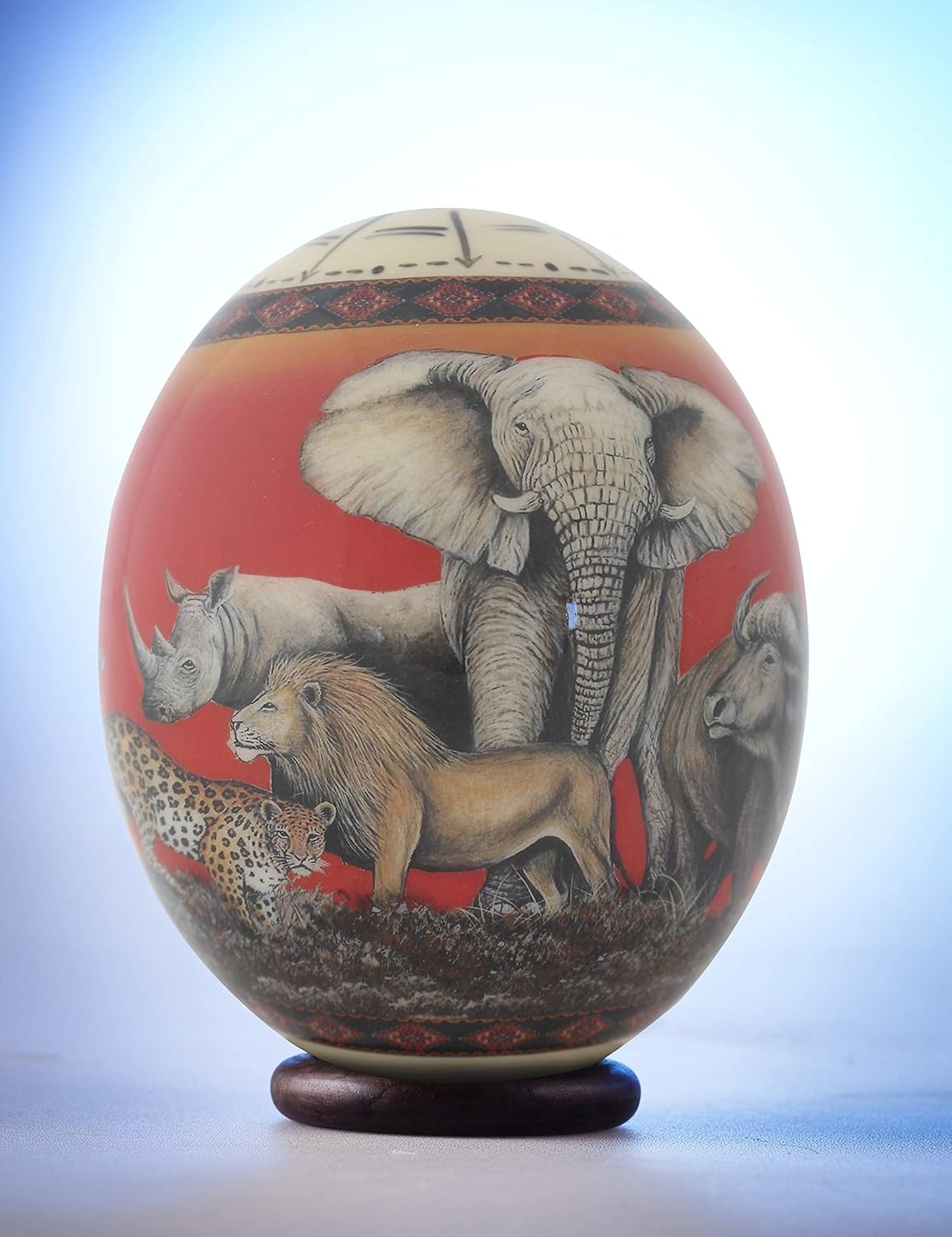 The African Big 5 are portrayed against a rich red sky on the characteristic African bushveld. The Big 5 surround them in smaller snapshots in a vertical band that circles this unusual African decor item – the beautiful ostrich eggshell. This price does not include a stand but choose from our range of brass stands for ostrich eggs.