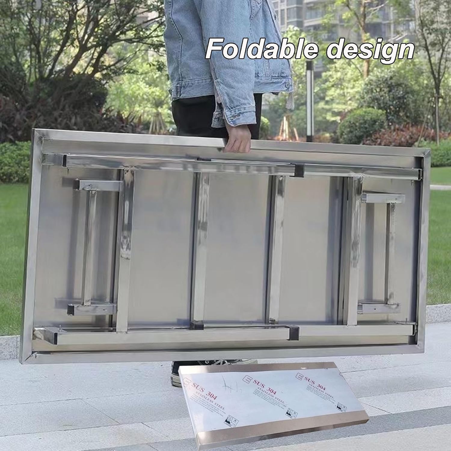 Product Name: Stainless Steel Folding WorkbenchMaterial: Stainless SteelDimensions:70x40x75cm, 80x40x75cm, 90x40x75cm, 100x40x75cm, 120x40x75cm, 100x50x75cm, 100x60x75cm, 120x60x75cm, 120x80x75cm1-piece construction for effortless portability and storage—folds and unfolds without toolsDual-spring design enables quick folding at table corners for swift, stable setup that saves time and effortNo assembly required—open and use immediately. Flexible and convenient for family gatherings, outdoor courtyards, restaurants, hotels, banquets, and moreAdjustable foot pads and threaded base feet adapt to varying terrainsProduct ListWorkbench x1Important Notes:Due to manufacturing processes, stainless steel surfaces may exhibit slight weld marks.Minor scratches may be present on stainless steel components.All dimensions are manually measured and may have slight variations.Images may show slight color differences due to varying shooting angles and lighting conditions.