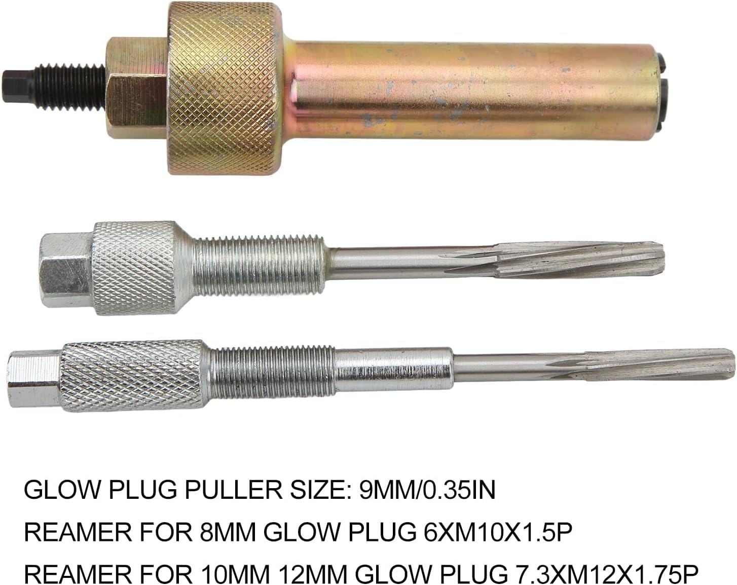 Specification:Item Type: Glow Plug Puller Reamer SetMaterial: MetalGlow Plug Puller: Approx. 9mm/0.35inReamer for 8mm Glow Plug 6xM10x1.5pReamer for 10mm 12mm Glow Plug 7.3xM12x1.75pFitment: Replacement for Benz VehiclesApplication:M10 reamer; 2.1/2.2/2.7/3.2CDI, intelligent R660 (OM611/612/613);M12 reamer; 2.0/2.2D, 2.5D/TD, 3.0D/TD (OM604/605/606);Electric plug extractor; OM611/612/613Package List:1 x Glow Plug Puller2 x Reamer1 x Tool BoxNote: Please note that the new type and old type of this product will be sent randomly, and make sure you will not mind before ordering.