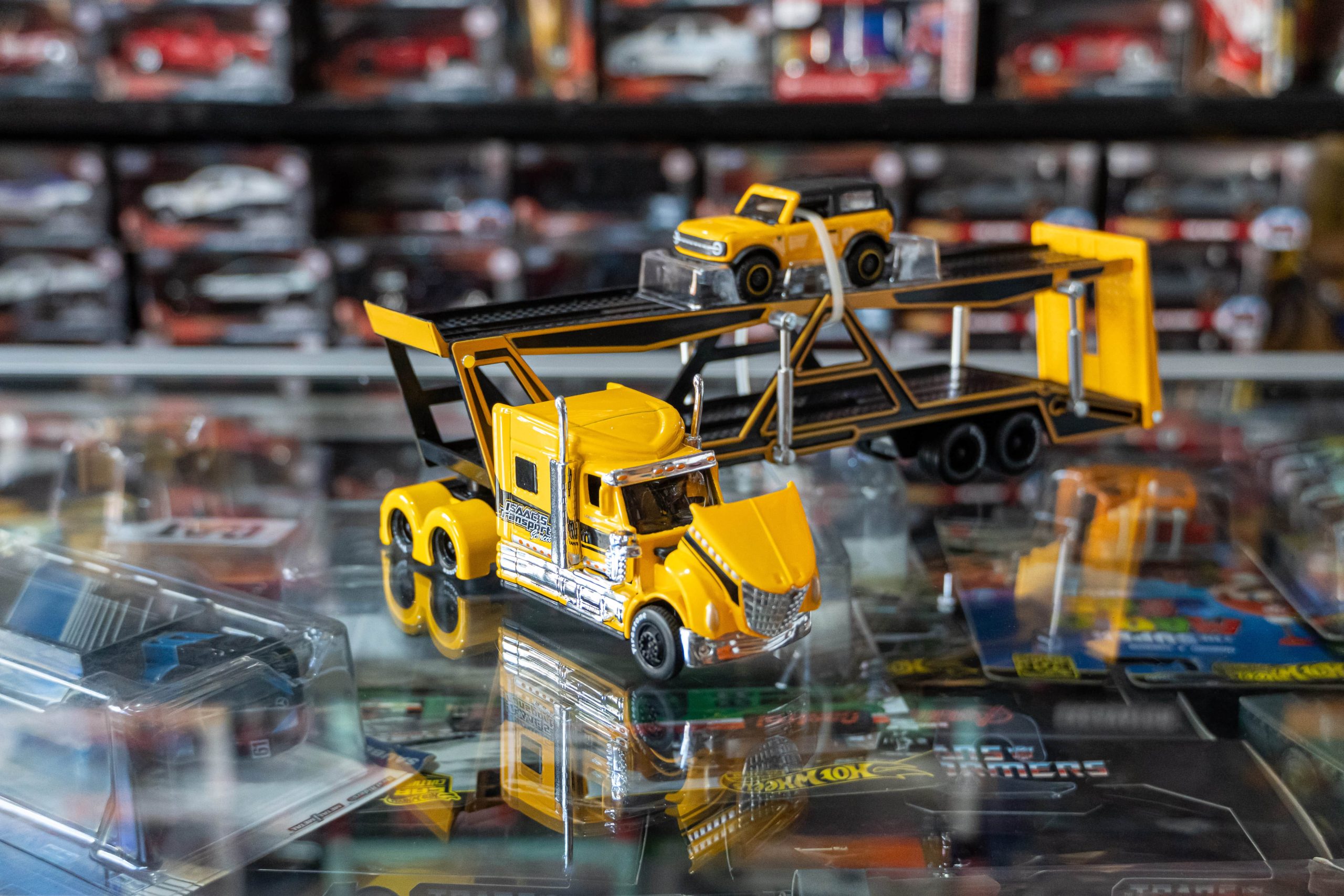 -Tráiler tipo plataforma en color amarillo con detalles cromados.