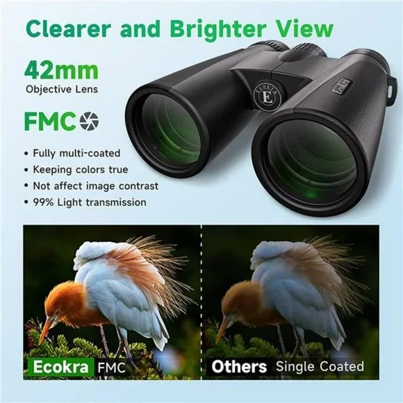 🧿【12x42 HD High Powered Binoculars for Bird Watching】Ecokra professional HD bird watching binoculars for adults is equipped with 12X high power magnification and 42mm objective lenses,provides you 374ft/1000yds large field of view,delivers large clear and bright image details.Perfect for various outdoor activities:bird Watching, hunting, hiking, camping, stargazing, traveling, sports,concerts.Ideal bird watching gifts for adults,kids 3-12 years boys and girls.🧿【Powerful BAK4 Prism& FMC Binoculars,Work Well in Night Vision Day】Binoculars for adults night vision and day is designed with 42mm objective lenses, collects more lights,makes the image more transparent,clearer and brighter.Also with high-quality BAK4 prism and advanced high definition multi-layer FMC coating,keeping colors true,light transmission higher.Even in low light,binoculars for hunting still offers you clear and bright view.🧿【18.5mm Large View Eyepieces, Farther and Wider Field of view】The small but powerful hiking Binoculars features a 18.5mm large view eyepieces,allows you to see things clearly at a distance of 1000m,makes you look farther and see wider.Eyepiece cover effectively protects the lens from scratches.The rotable rubber view eyepieces are makes of ABS plastic,comfortable and no dizziness.Both suitable for glasses wearer or not. Choose Ecokra binoculars for adults,make your travel happier.