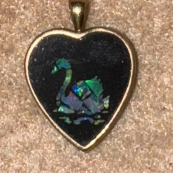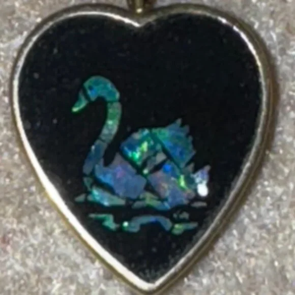 14 kt gold surrounding onyx inset with Australian crystal opal to make a swan inside a heart. Pendant is about the size of a penny. Intarsia. The onyx is the background and the opal is set via intarsia into a swan design. This is an Australian opal as well.