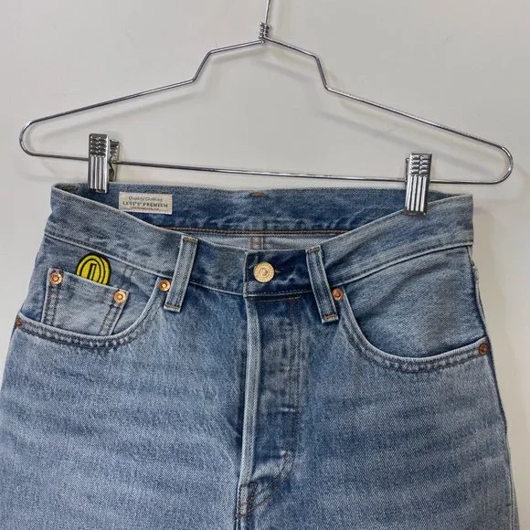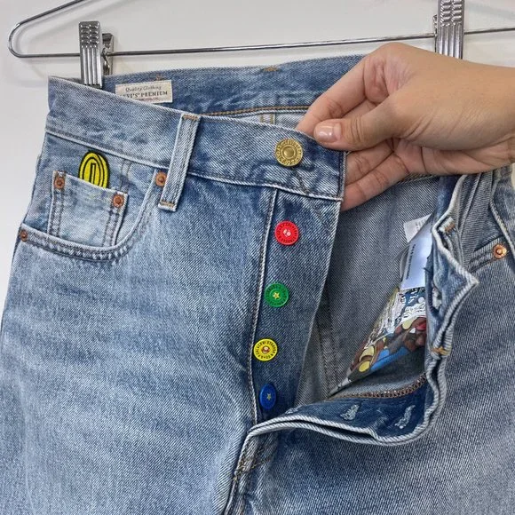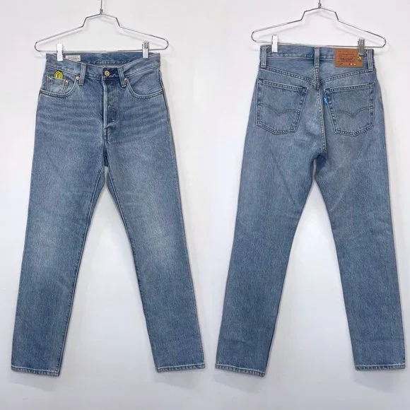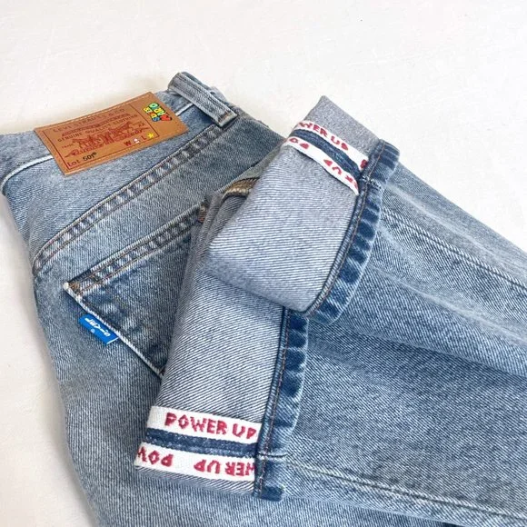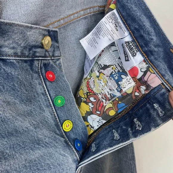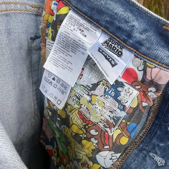 Power up with Mario, Luigi, Yoshi and Princess Peach. The Super Mario™ crew is jumping off the screen and onto Levi’s® iconic denim. Our limited-edition collection celebrates iconic characters from the popular franchise with colorful streetwear styles made for super fans.Levi's® x Super Mario™: the world of Super Mario™ comes to life with this unique collection featuring your favorite characters from the Mushroom KingdomEach product is made with a special L-Tab in a random color and reads, "POWER UP" on the back in the notable Super Mario™ fontOur 501® ‘93 Straight Jeans are inspired by a fit that defined the culture a generation ago, bringing true early ‘90s style to a new generationA vintage-inspired fit that sits at the waistDesigned with a slightly higher riseFeatures an embroidered coin above the coin pocketFinished with thoughtful details including: colorful Super Mario™ character button shanks, gold coin top shank, Mushroom kingdom print pocket bag, special leather back patch and Mario graphic on the inside waistbandCustom selvedge cuff reads, "POWER UP"Big E Levis tab!Brand - LEVI'S® X SUPER MARIO Style - Five Pocket Button flyName - 501® '93 STRAIGHT MEN'S JEANSMeasurements:Size on tag - 25Waist - 27”Rise - 10”Hips - approx. 37”Inseam - 29”Cuff - 13”Color - Light/Medium WashMaterial - DenimCondition - MINT unworn condition. Item #: 32483048