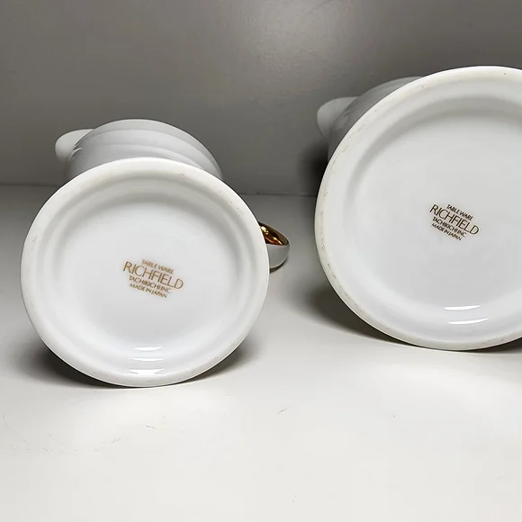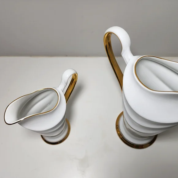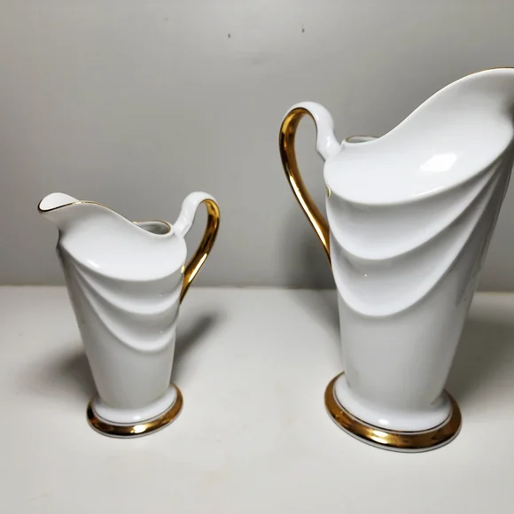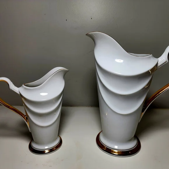 Hard to Find the pair of these pitchers2 Adam Eve Richfield Tachikichi Japan Pitchers White Porcelain China Gold AccentsVintageArt Deco Style10" and 7"Will sell separately Elevate your dining table with this exquisite white and gold serveware set, featuring a modern sculptural design. The sleek, wave-like texture and metallic base create a stunning visual contrast, perfect for sophisticated dining occasions.