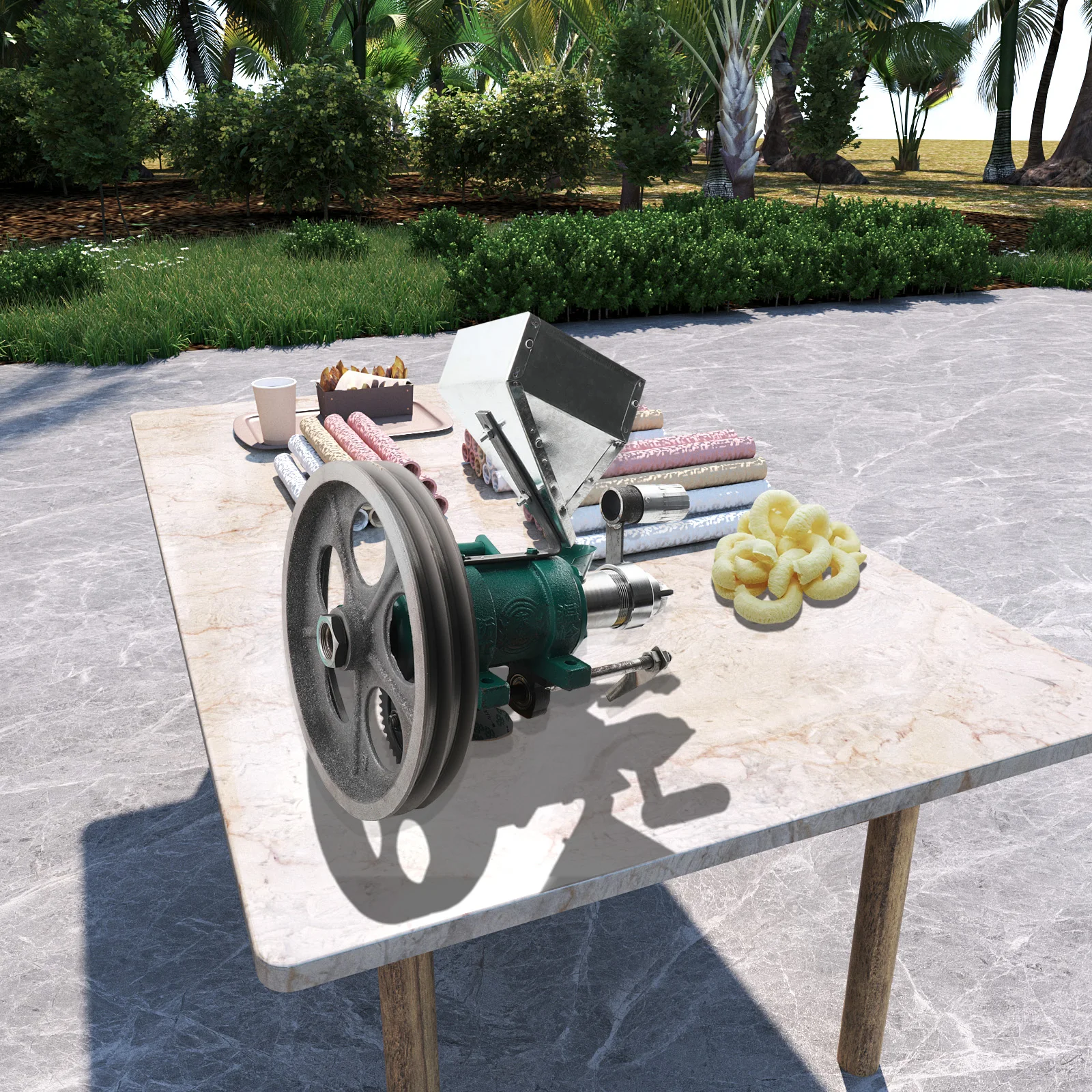 The machine with rice, corn as raw material, and can added different flavorings, use its heating to puff the original materials into 90 times amazing taste puffing snacks. The extruder can produce different shapes with different molds, like spicy stick, sweet stick and other snacks.