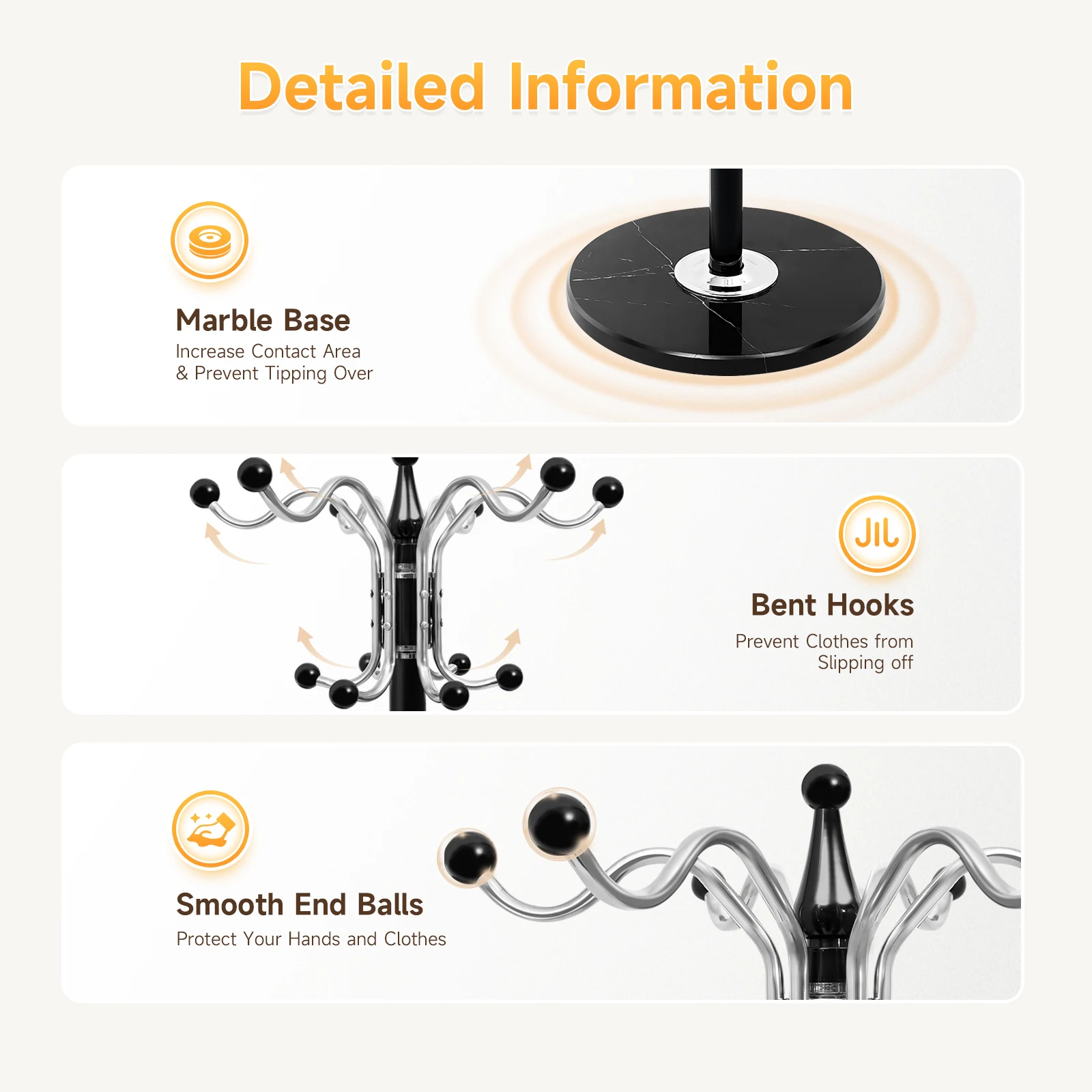 Bent Hooks: This design can effectively prevent hats and clothes from slipping off, and it's convenient for you to hang.