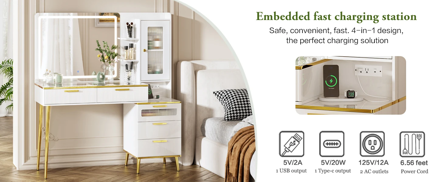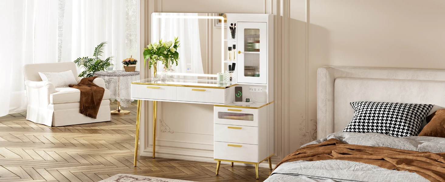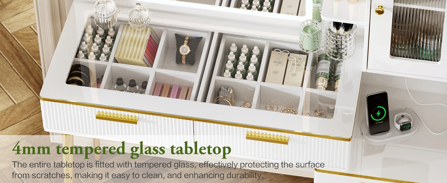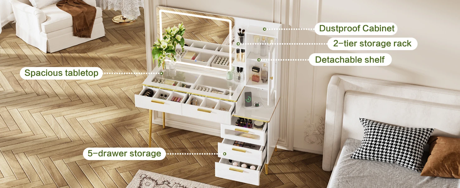 4. 【Metal slides and Handles】 This white Vanity Desk is made of scratch-resistant, moisture-resistant MDF boards, and sturdy metal handles, a light wipe with a damp cloth will give the fresh look. easily on ball bearings, allowing you to effortlessly push and pull drawers to keep your items neat.