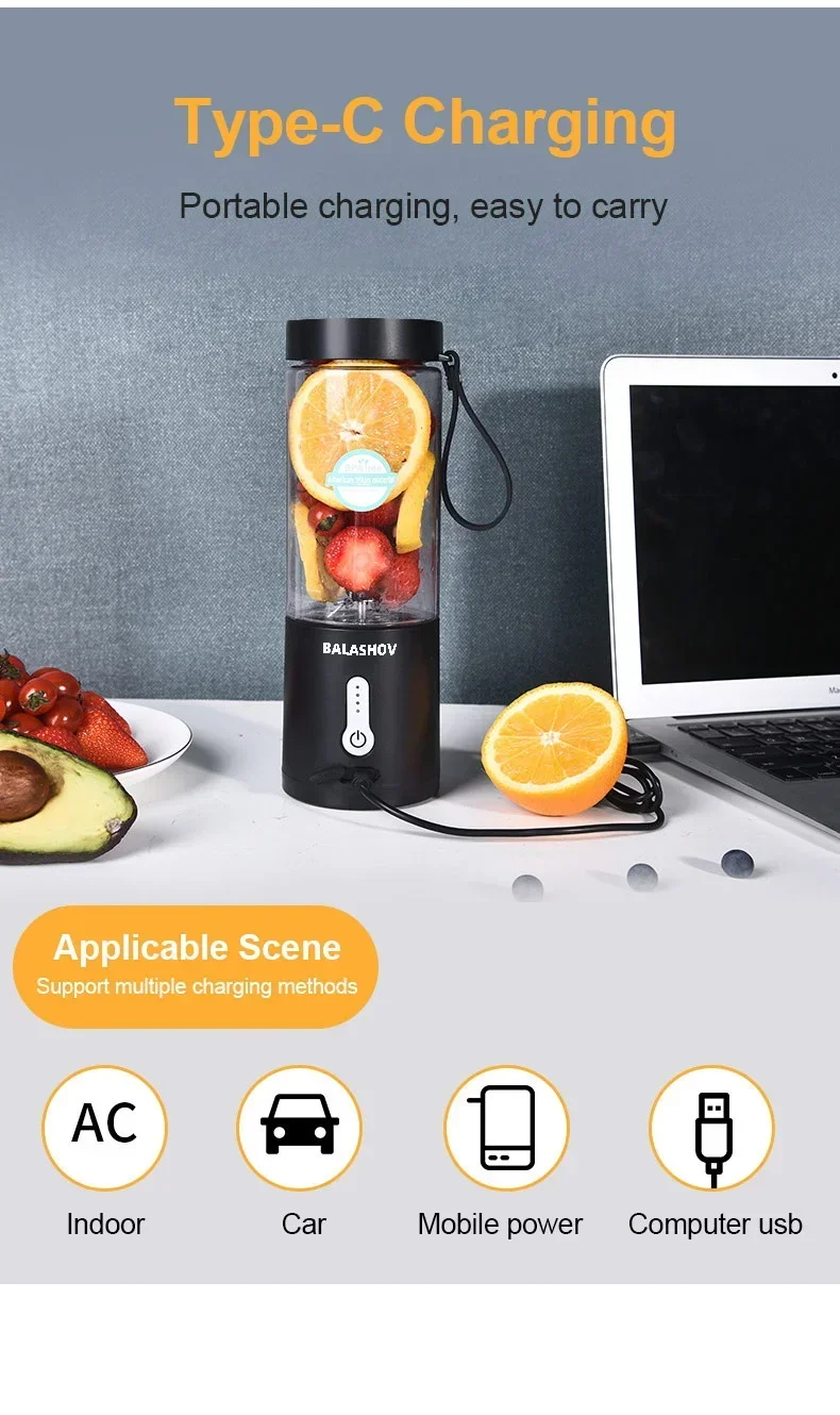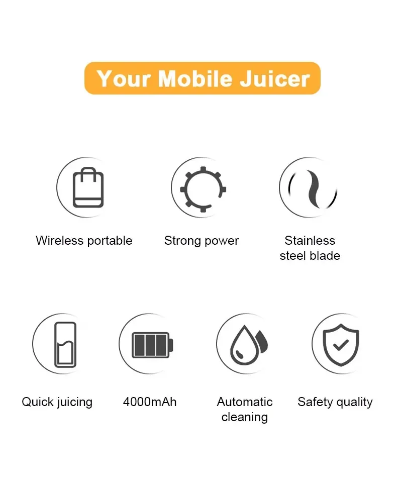[Rechargeable&Type C Port]: Built-in 4000mah 7.4V powerful battery, The portable blender can produce many cups of juice at one full charge for 3h, the Type-C port is more convenient than the USB port and it could be charged through a power library, laptop, desktop, mobile phone, and car charging port[Safety Protection System]: Arrow towards the button and press TWICE to start. The magnetic induction is safe to use and clean,the juicer cup stops working when the fuselage is separated from the machine and stop within 5 seconds when the bottle is empty.