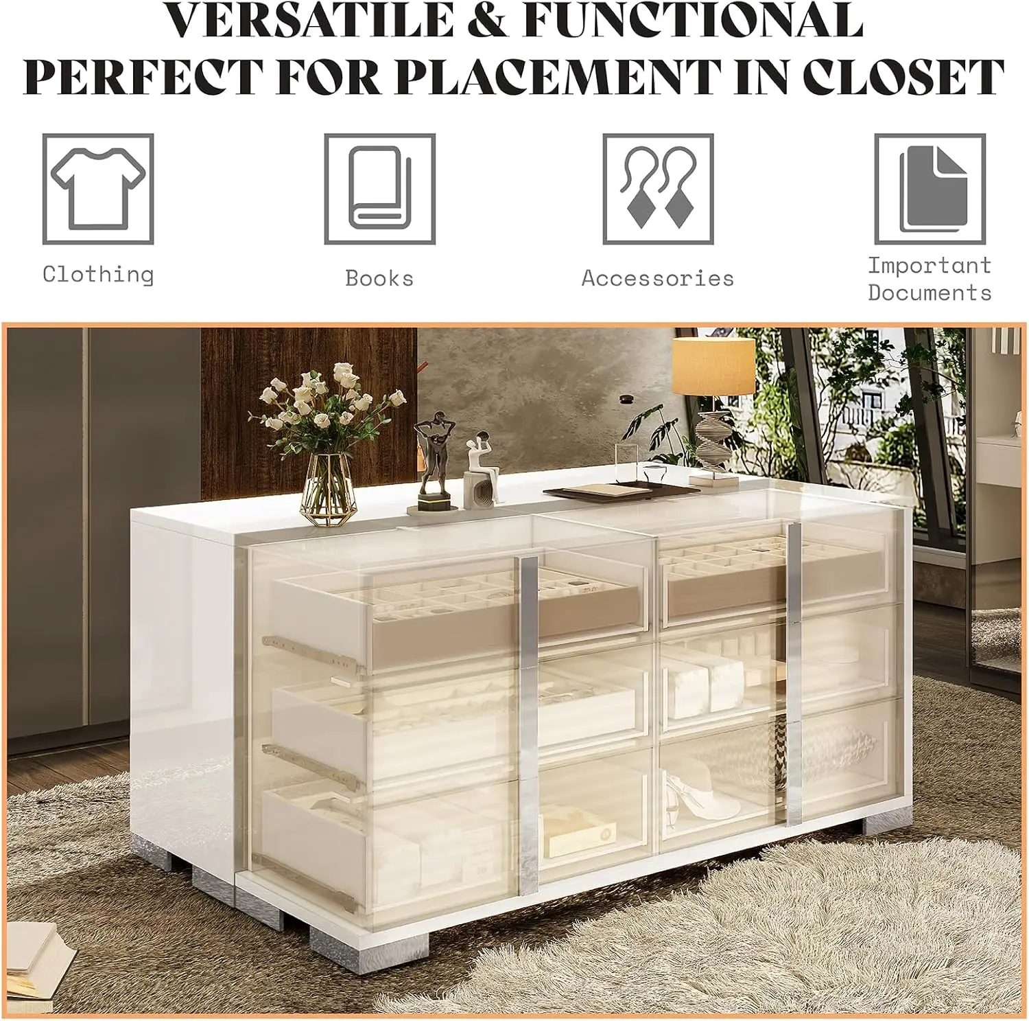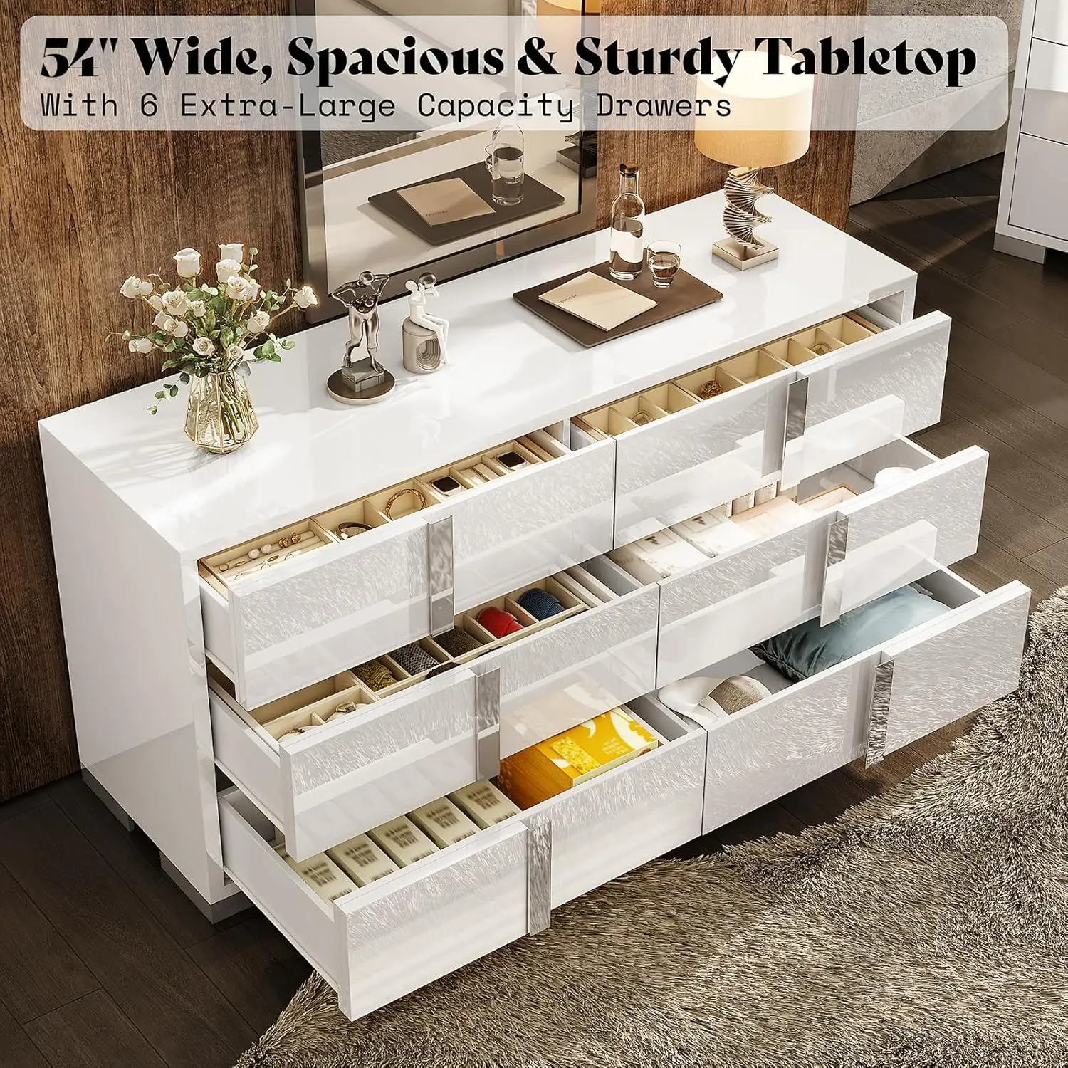 • [Modern High Gloss] 6 Drawers Dressers boast high gloss surface with silver grooved handles and unique cabinet feet, adding depth and texture to its appearance. Easy to clean and maintain for a lasting shine