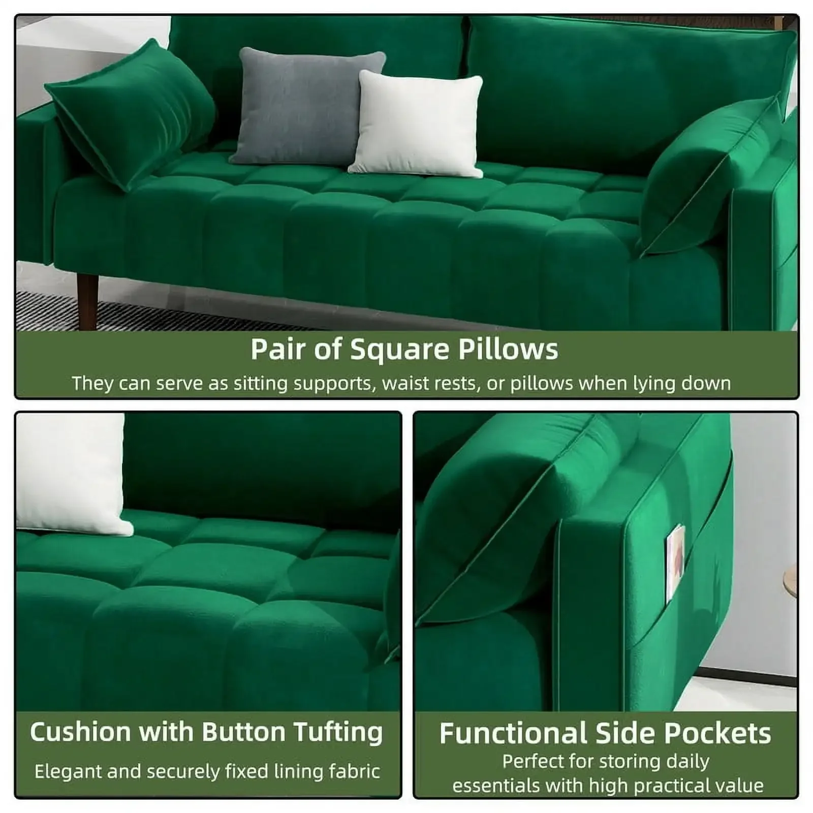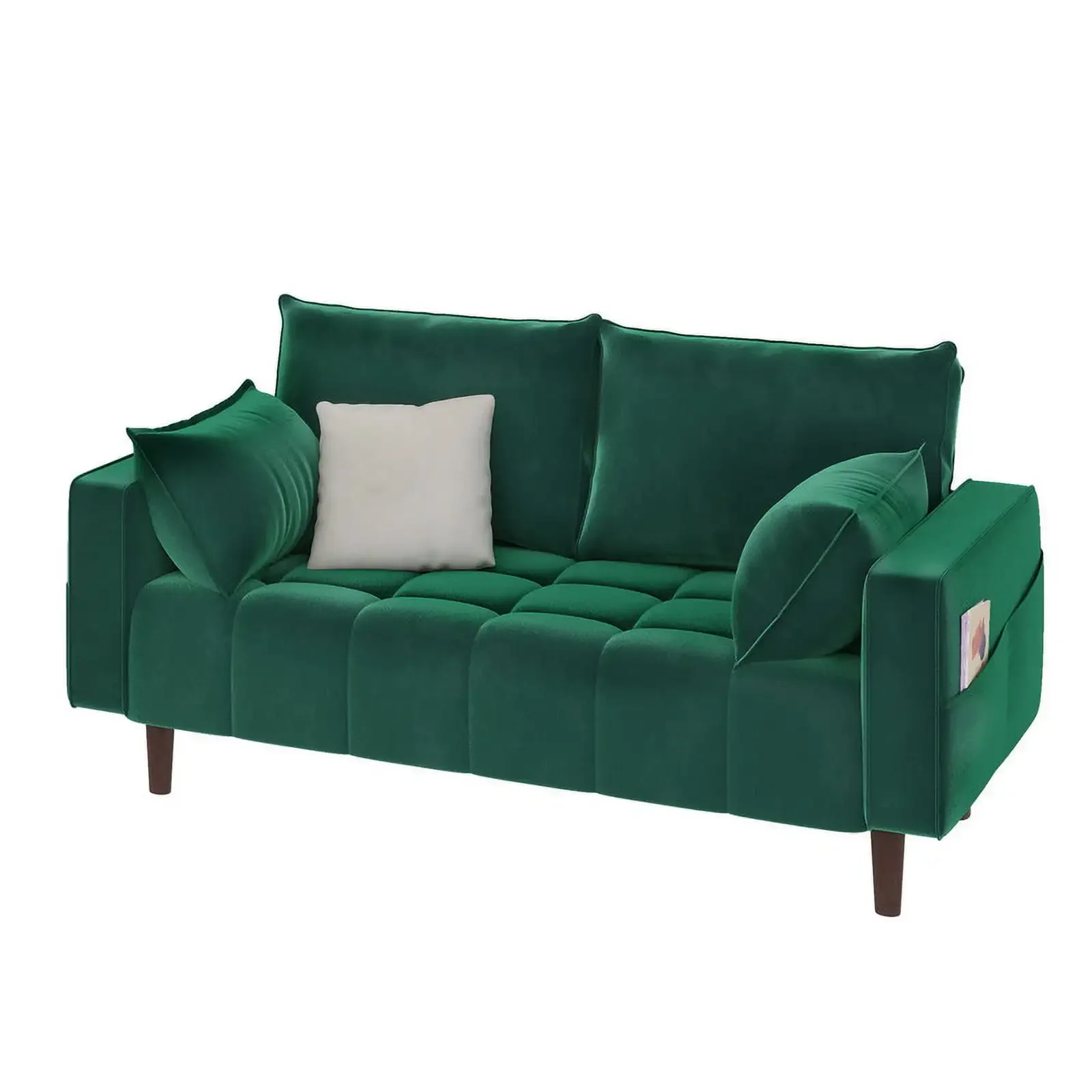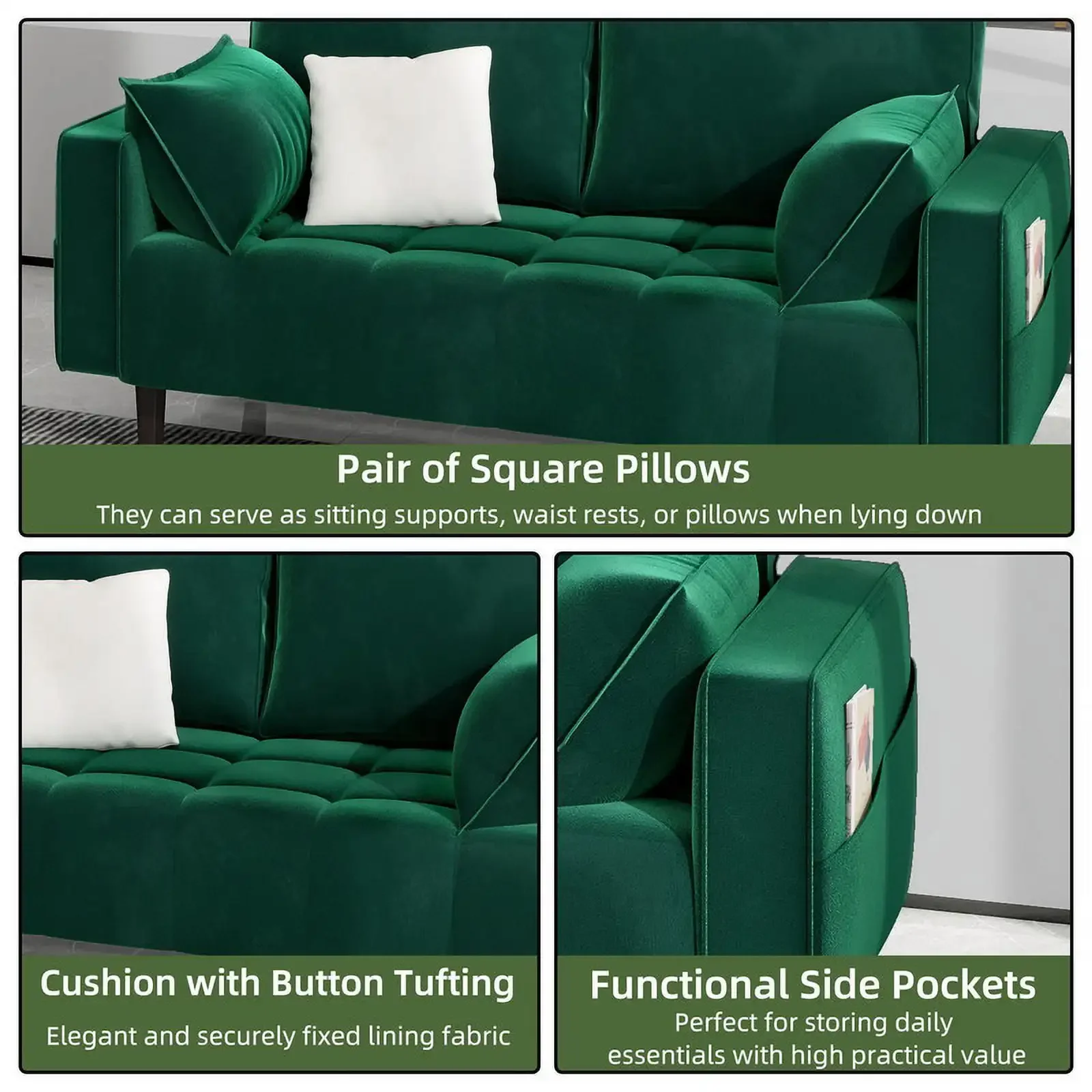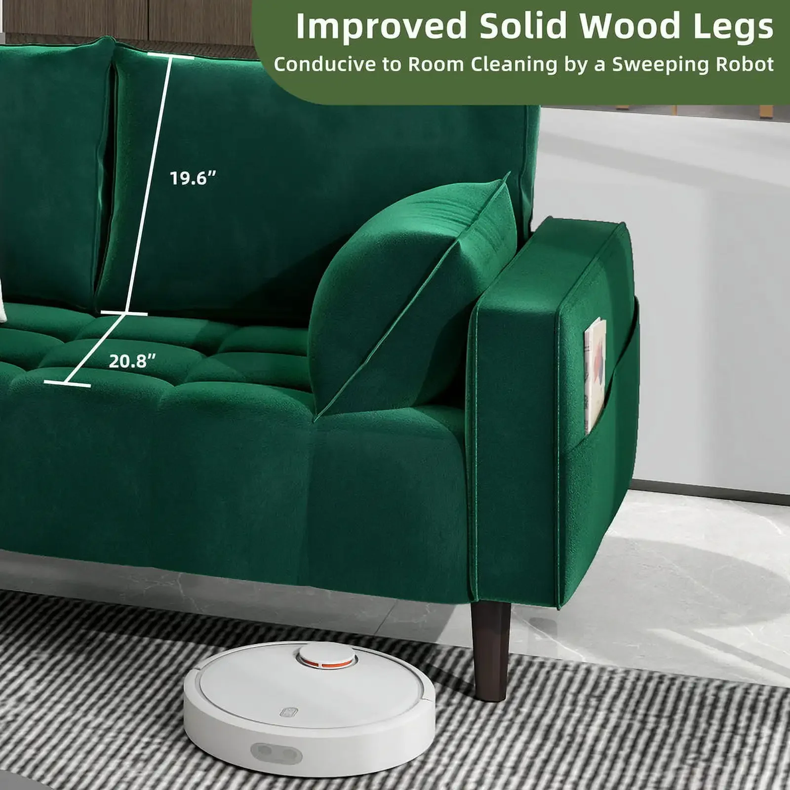 Immerse yourself in the allure of mid-century elegance with our loveseat sofa. Imagine sinking into luxurious velvet, enveloped by soft cushions in a cozy retreat. Let the smart storage pocket keep your space neat, while sturdy solid wood feet ensure unwavering support for serene relaxation. This piece, a blend of timeless charm and modern comfort, is great for adding a touch of sophistication to your living room, study, or even a cozy reading nook.