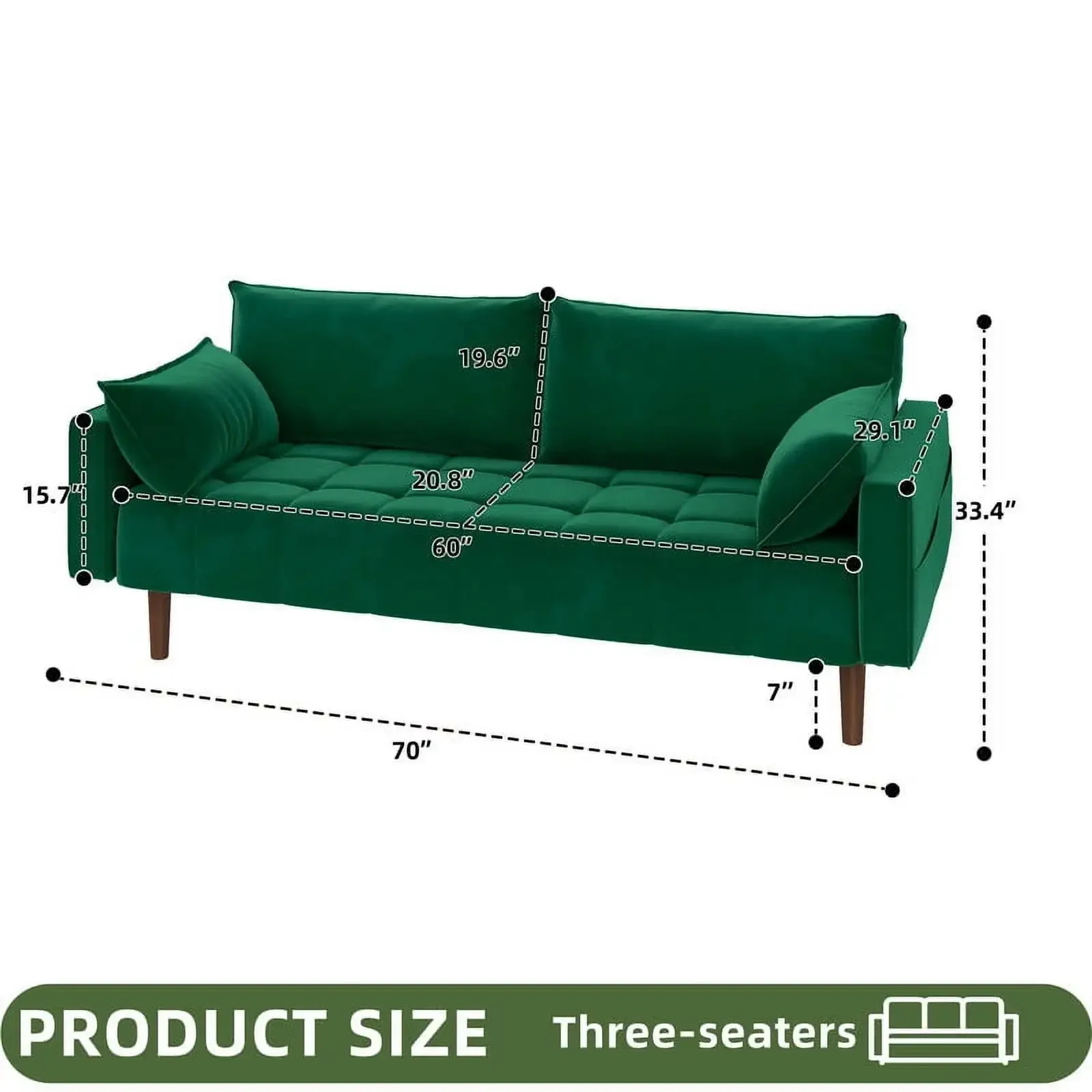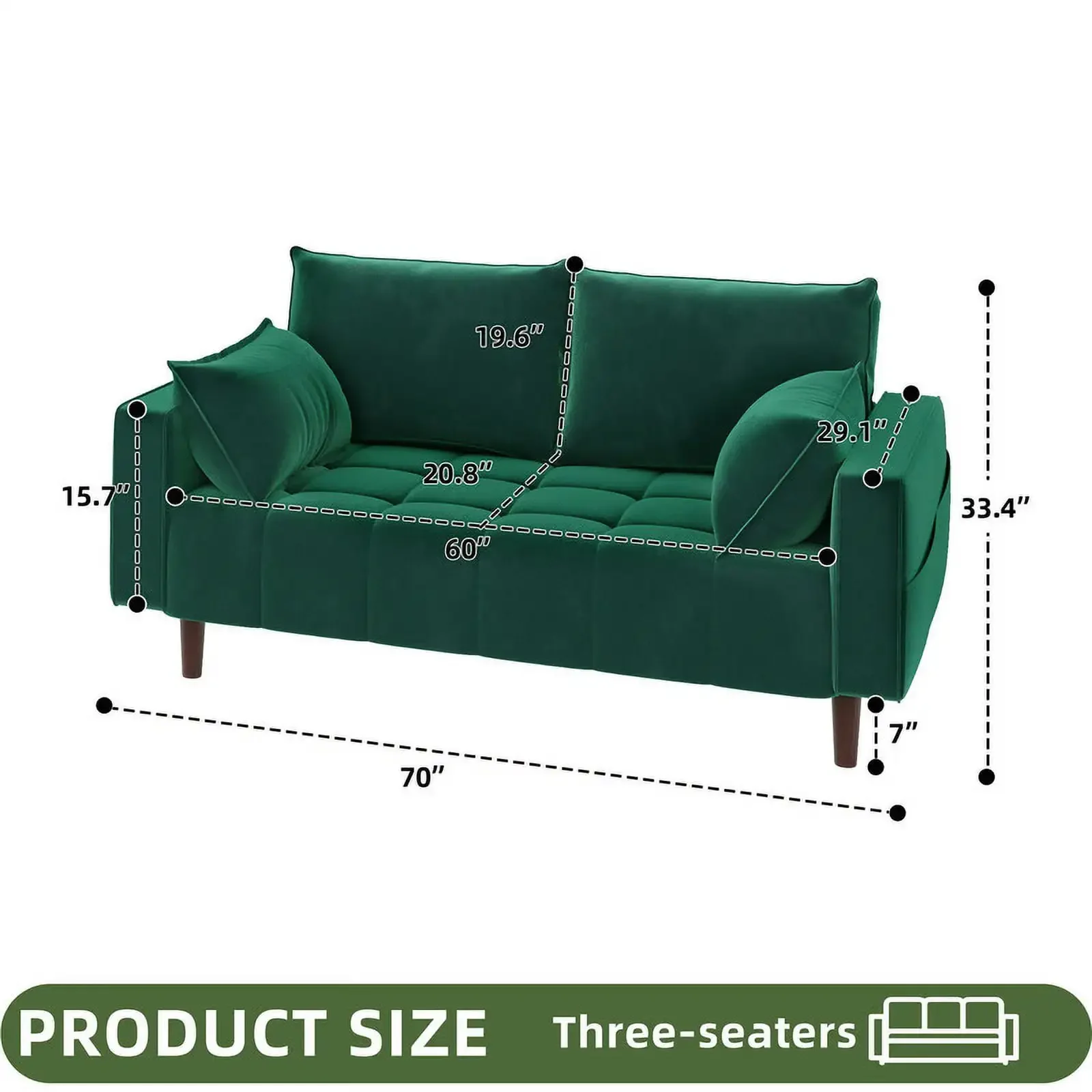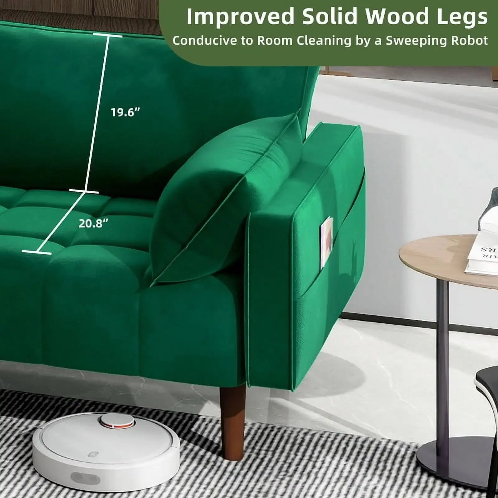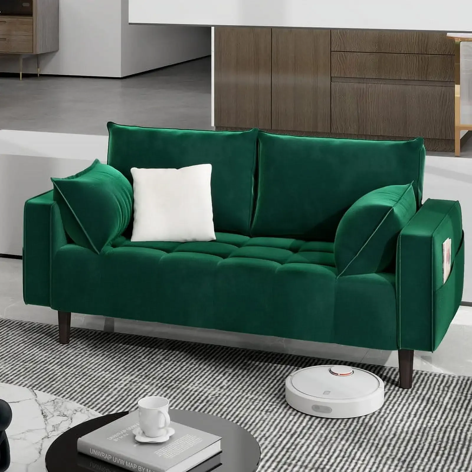 Immerse yourself in the allure of mid-century elegance with our loveseat sofa. Imagine sinking into luxurious velvet, enveloped by soft cushions in a cozy retreat. Let the smart storage pocket keep your space neat, while sturdy solid wood feet ensure unwavering support for serene relaxation. This piece, a blend of timeless charm and modern comfort, is great for adding a touch of sophistication to your living room, study, or even a cozy reading nook.
