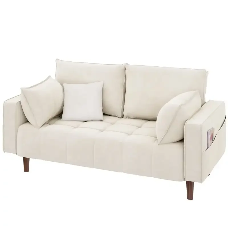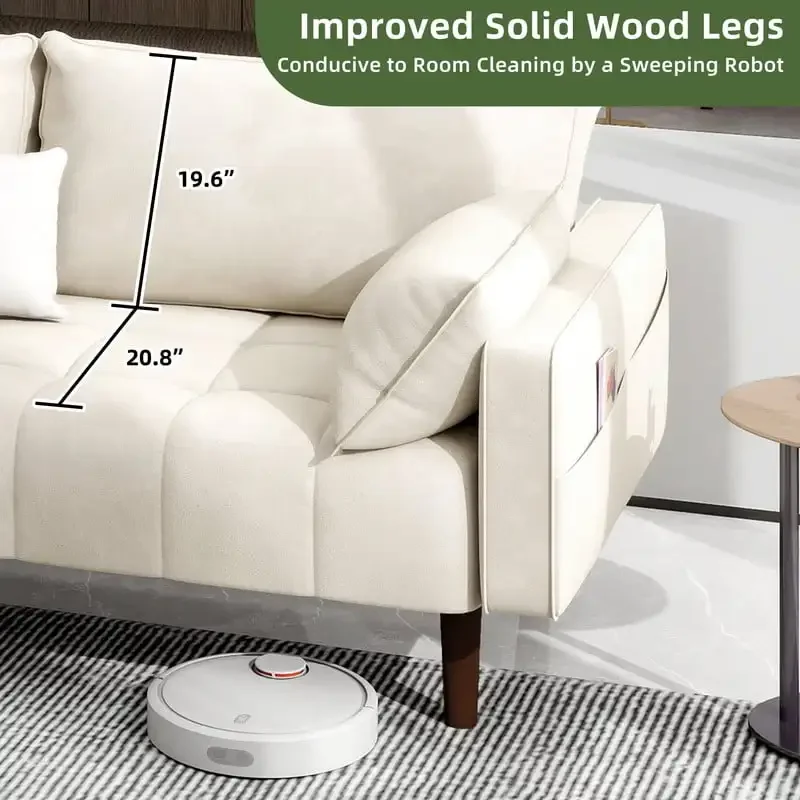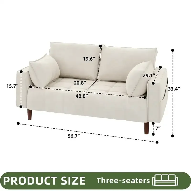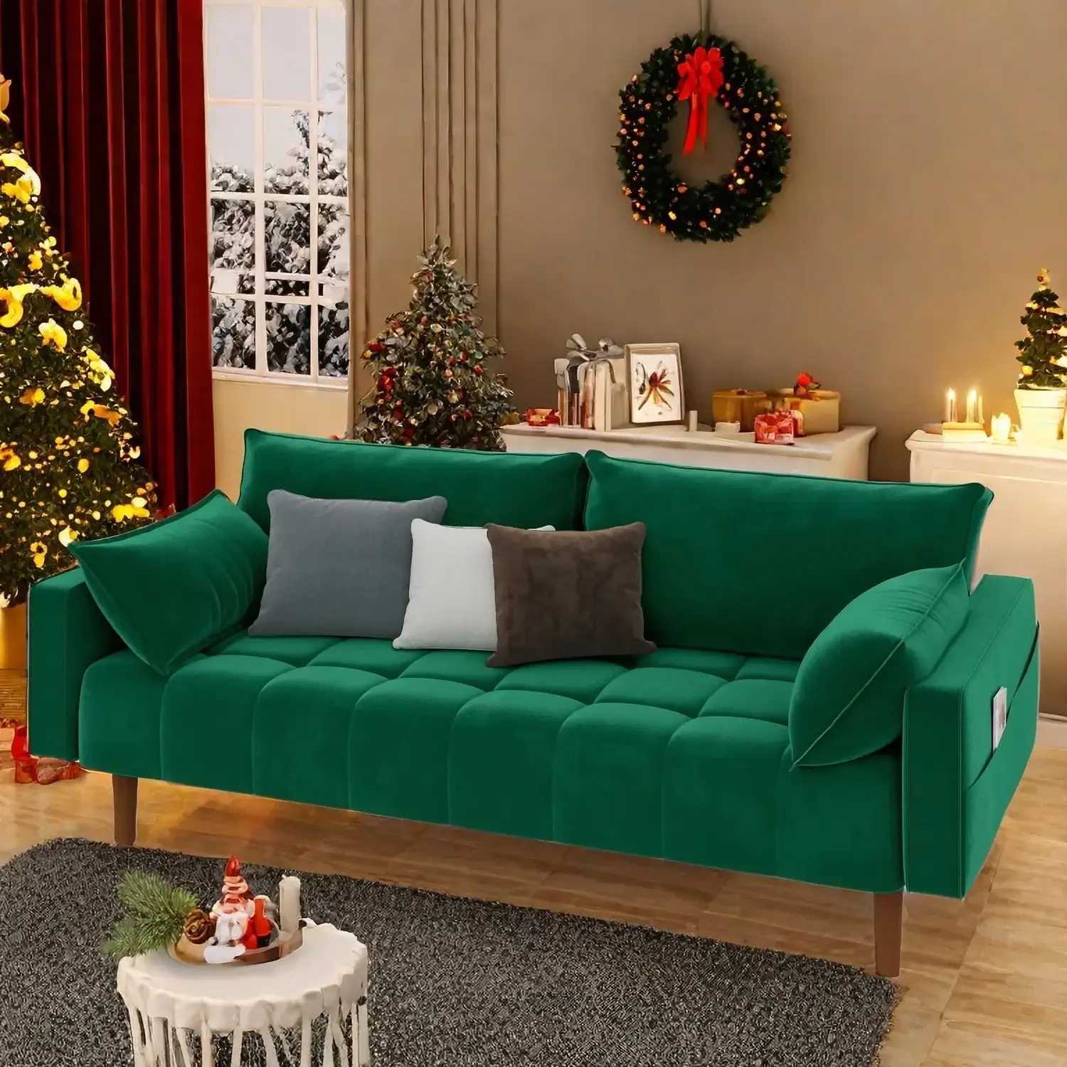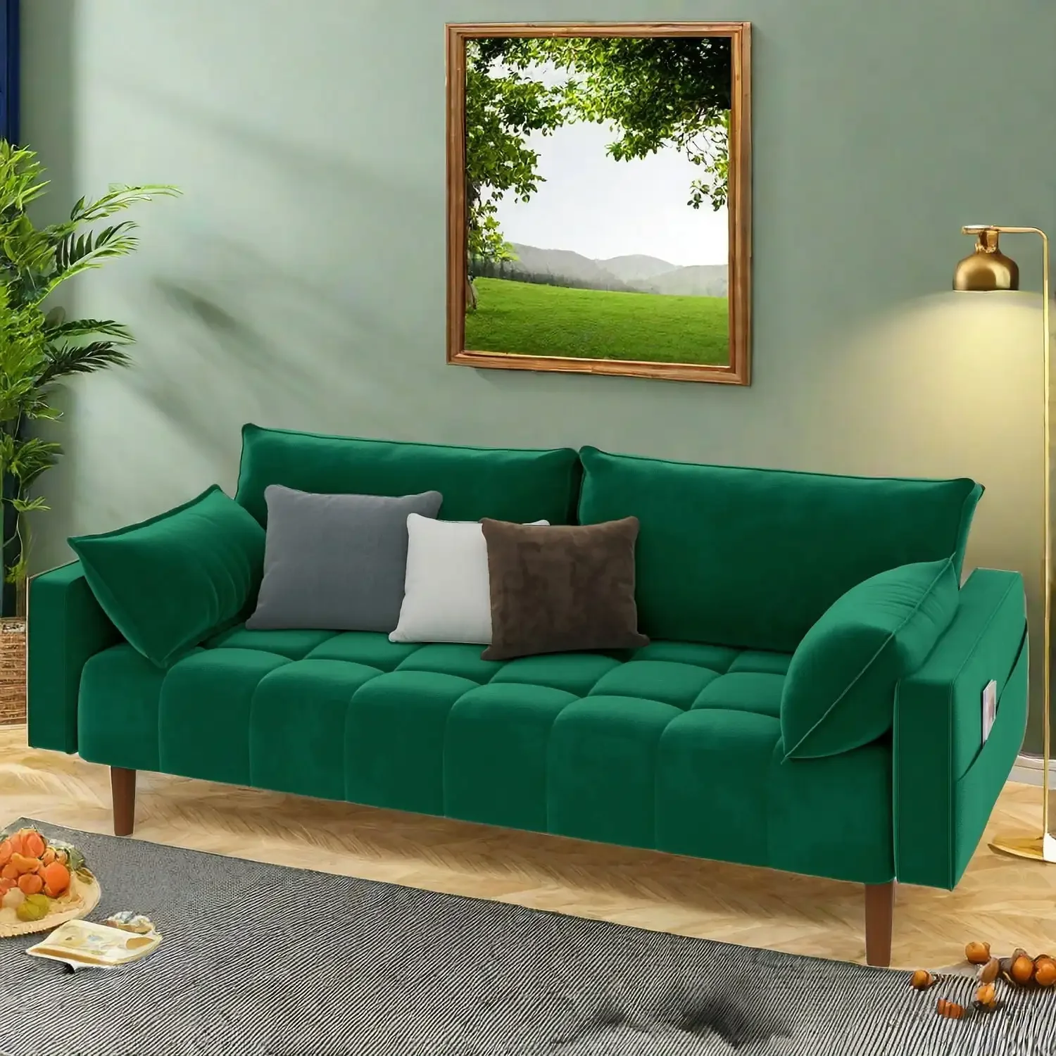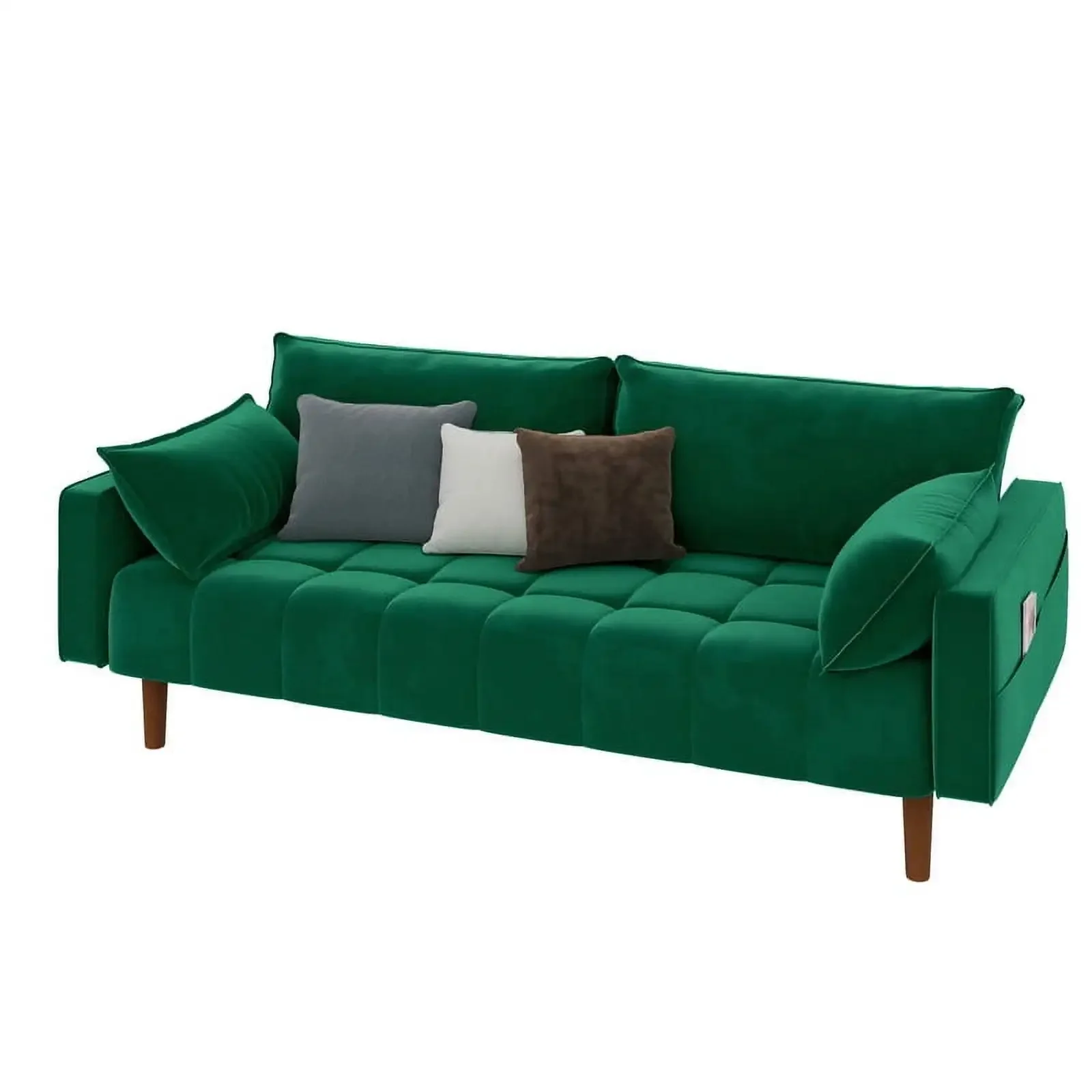 Immerse yourself in the allure of mid-century elegance with our loveseat sofa. Imagine sinking into luxurious velvet, enveloped by soft cushions in a cozy retreat. Let the smart storage pocket keep your space neat, while sturdy solid wood feet ensure unwavering support for serene relaxation. This piece, a blend of timeless charm and modern comfort, is great for adding a touch of sophistication to your living room, study, or even a cozy reading nook.