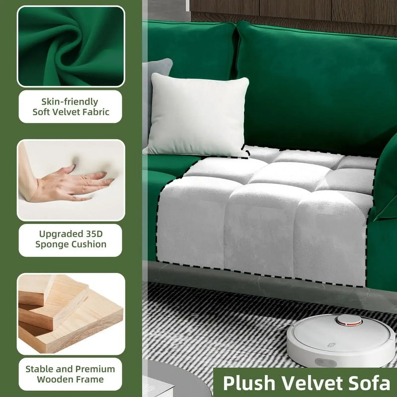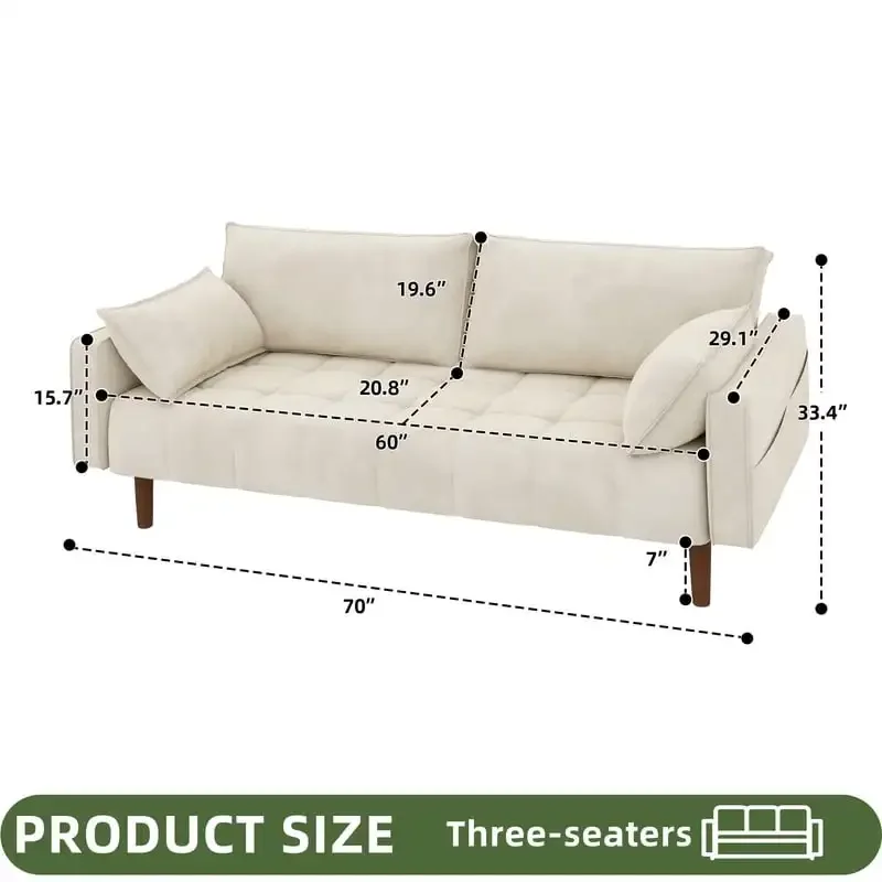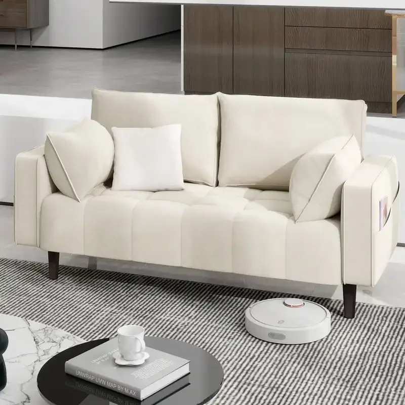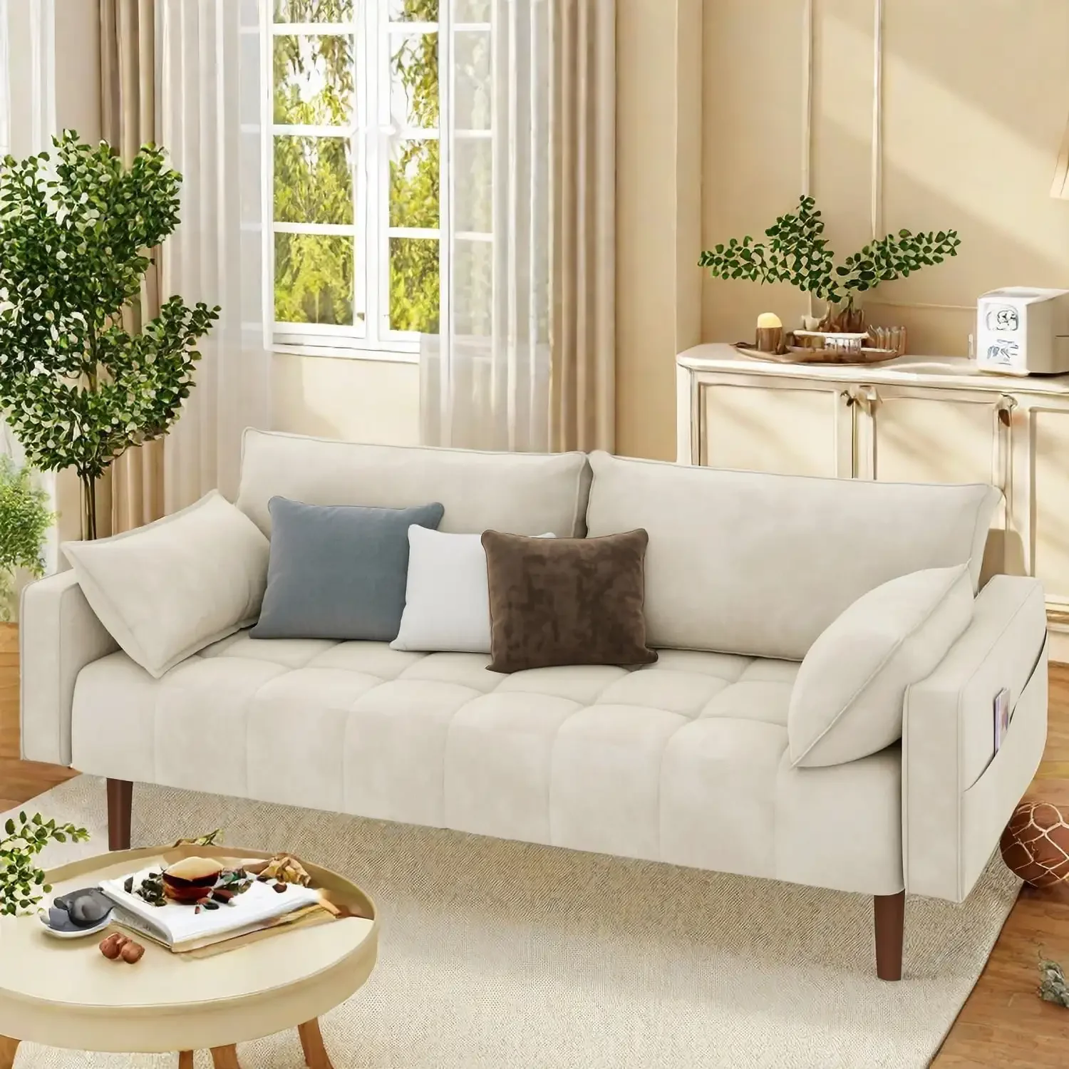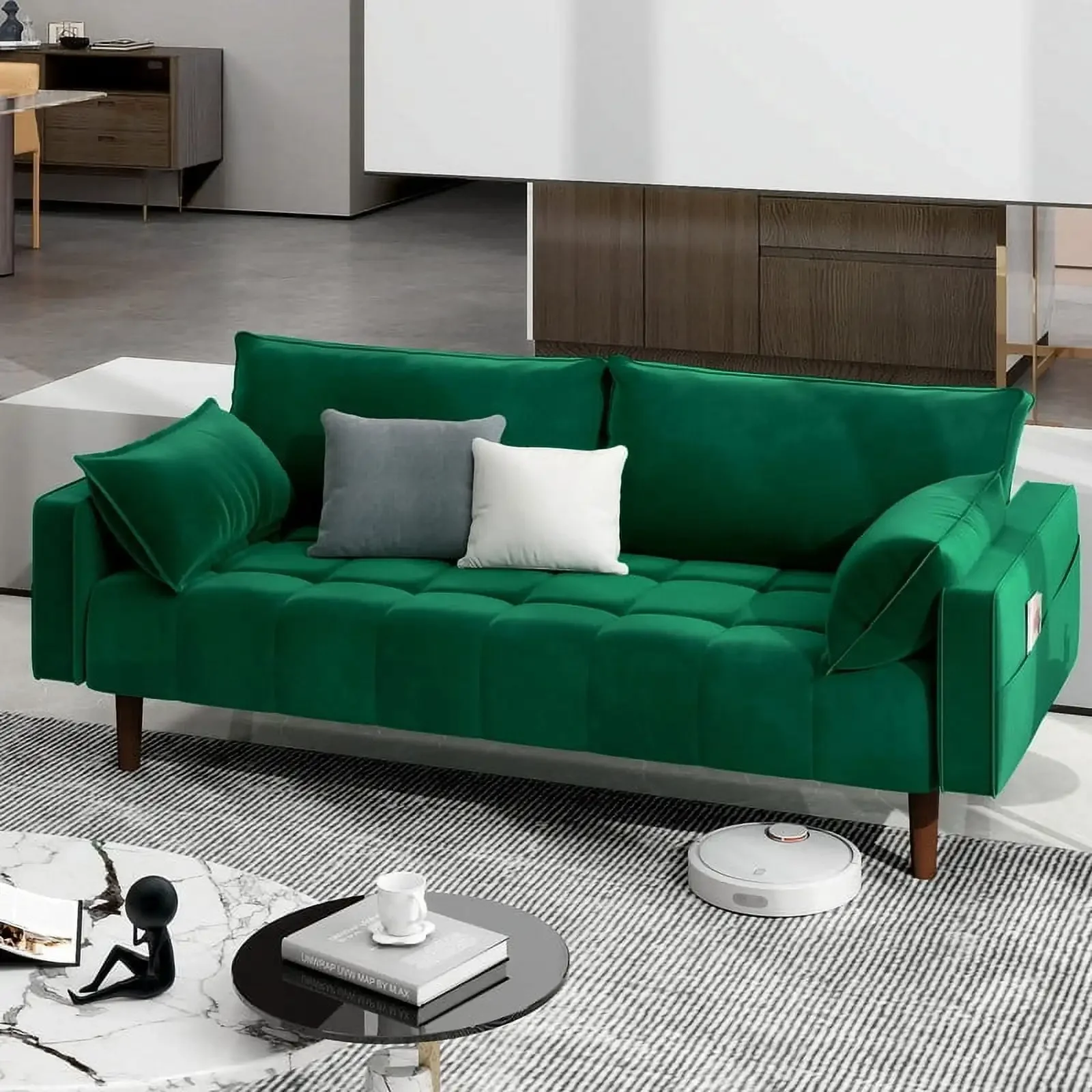 Immerse yourself in the allure of mid-century elegance with our loveseat sofa. Imagine sinking into luxurious velvet, enveloped by soft cushions in a cozy retreat. Let the smart storage pocket keep your space neat, while sturdy solid wood feet ensure unwavering support for serene relaxation. This piece, a blend of timeless charm and modern comfort, is great for adding a touch of sophistication to your living room, study, or even a cozy reading nook.