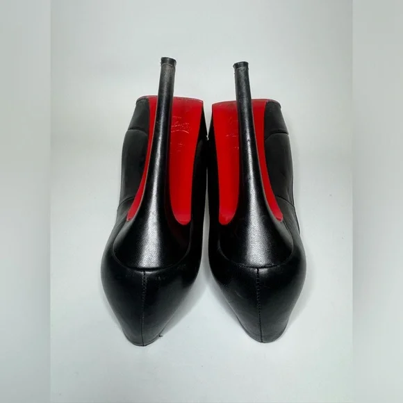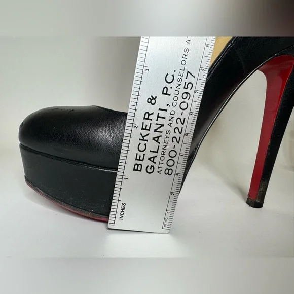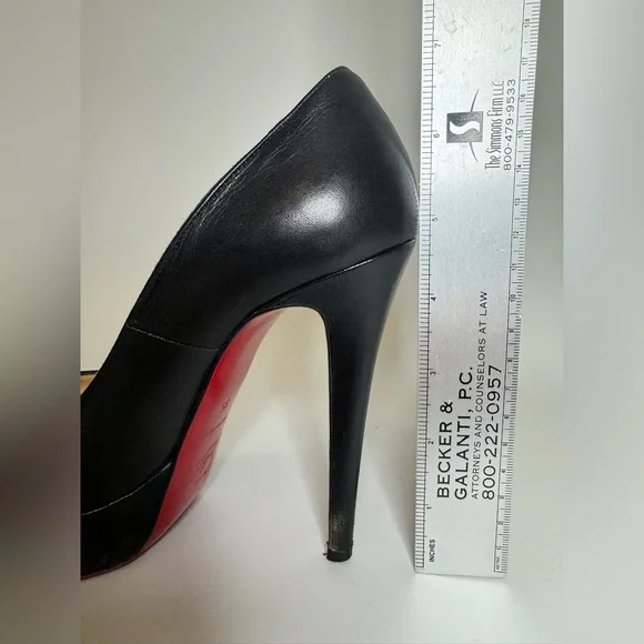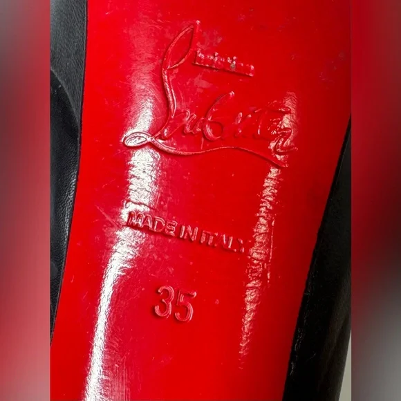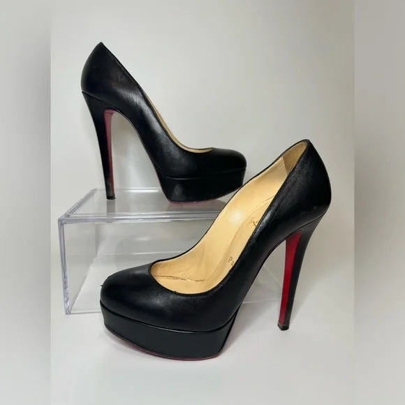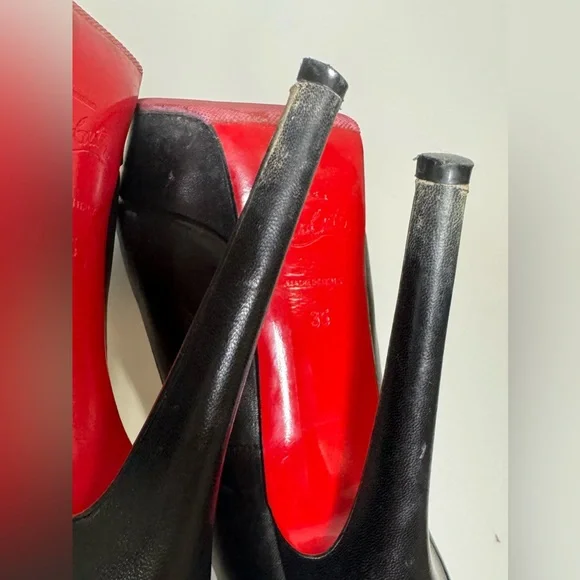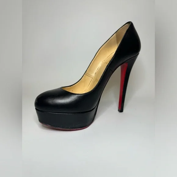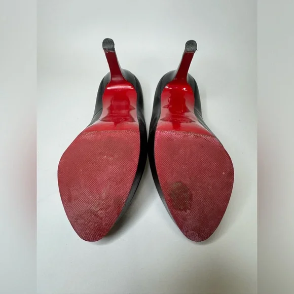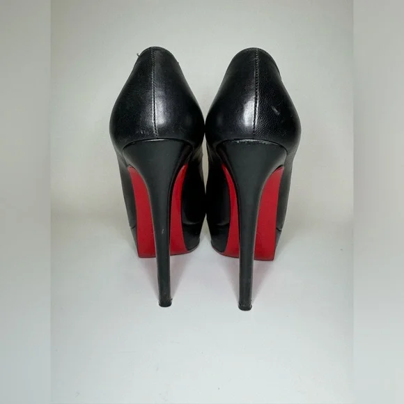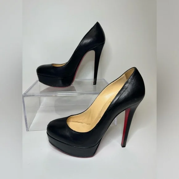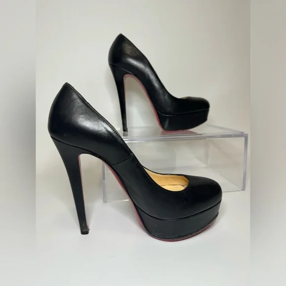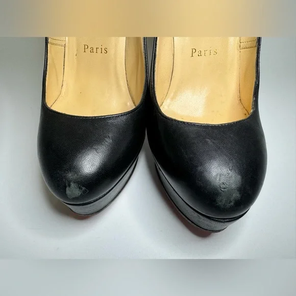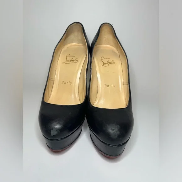 Size: IT 35, US 5PREOWNED 100% Authentic Christian Louboutin Bianca Black Platform High Heel Pumps. PREWORN condition with signs of wear, creasing, scuffs at toe, dust marks from storage and wear, professionally added textured red sole protectors. Pictures are of actual item for sale and part of the listing description. Please enlarge and review all pics carefully and kindly ask all questions before purchase. All sales are final.Original retail price $795No international shipments.