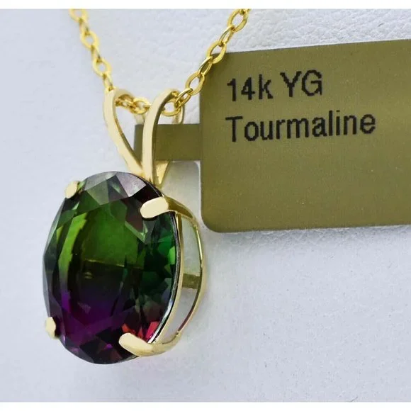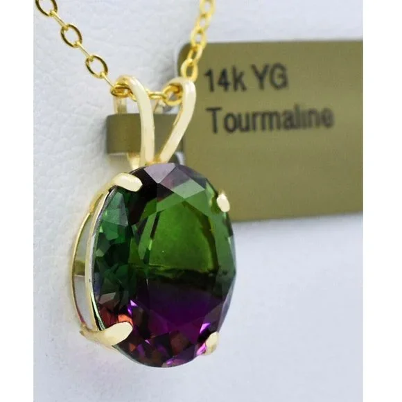 Metal purity: 14k Yellow GoldCondition: New with tagGemstone Type:1 created tourmaline - 5.77 carats tourmalinegrades,Hue . . . Green/PurpleTone . . . medium dark Saturation . . . vividNo inclusions or flawsDimension: 12 x 10 mm gemstone measurementsPendant :17 mm (0.67") - bail includedx 10 mm (0.39")