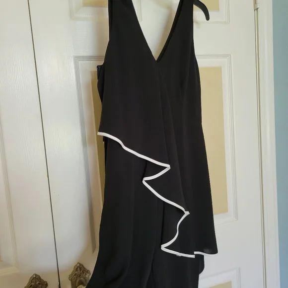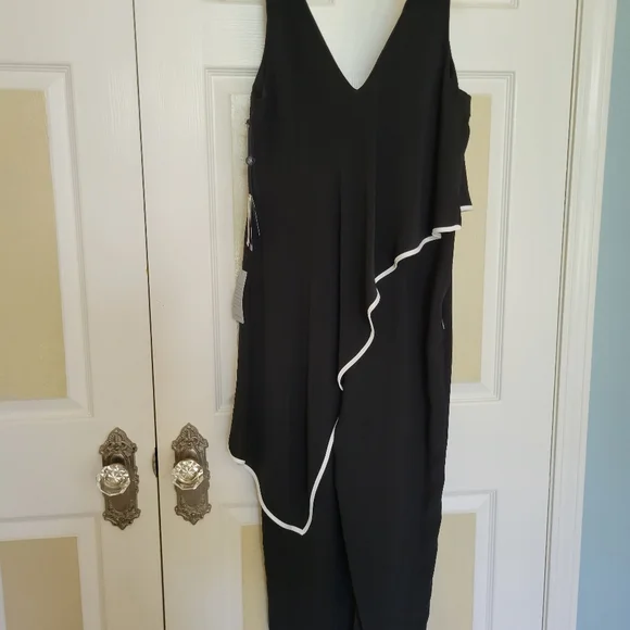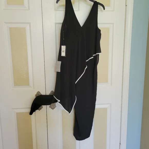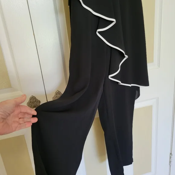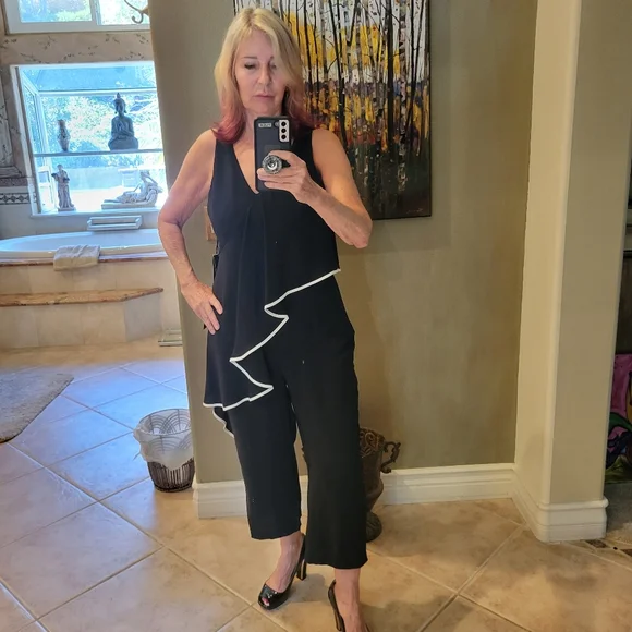 This stunning black jumpsuit exudes elegance and is ideal for any sophisticated occasion, from a chic brunch gathering to a glamorous wedding celebration. Crafted from lightweight fabric, it drapes beautifully over the body, enhancing the outfit's graceful flow and creating a flattering silhouette. The unique asymmetrical popover adds a touch of artistry and sophistication, drawing the eye and elevating the overall look.The cropped wide-leg pants not only provide a trendy silhouette but also ensure effortless mobility, allowing you to dance freely or mingle comfortably. This design is tailored to accentuate your figure, with a size 6 fit that will make you feel absolutely radiant and confident. For a reference point regarding leg length, I stand at 5'4" and weigh 123 lbs. I personally favor a shorter leg cut, as it beautifully showcases my shoes and adds a stylish finishing touch to this already exquisite outfit.