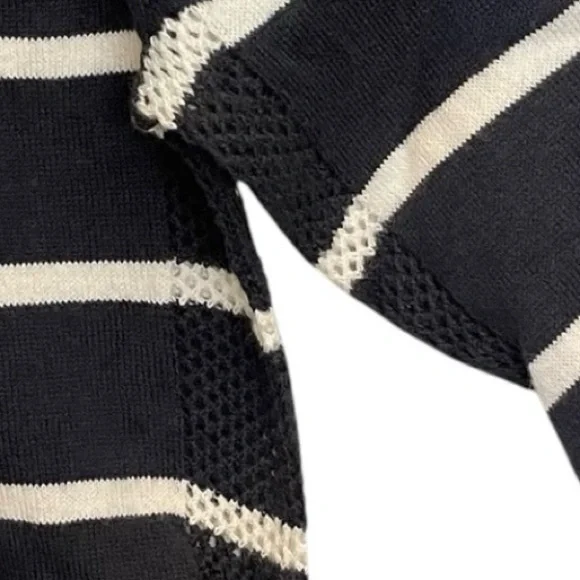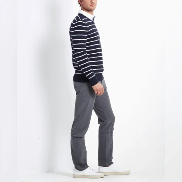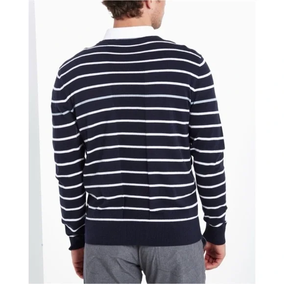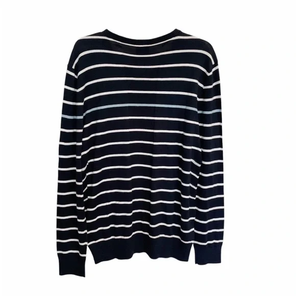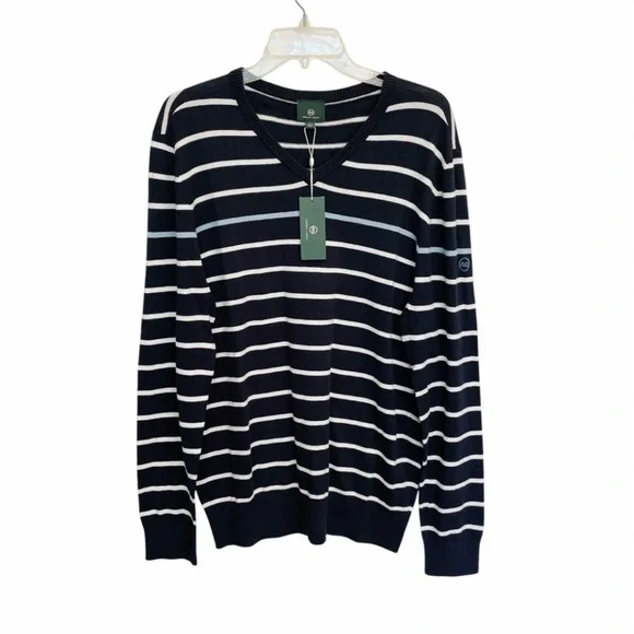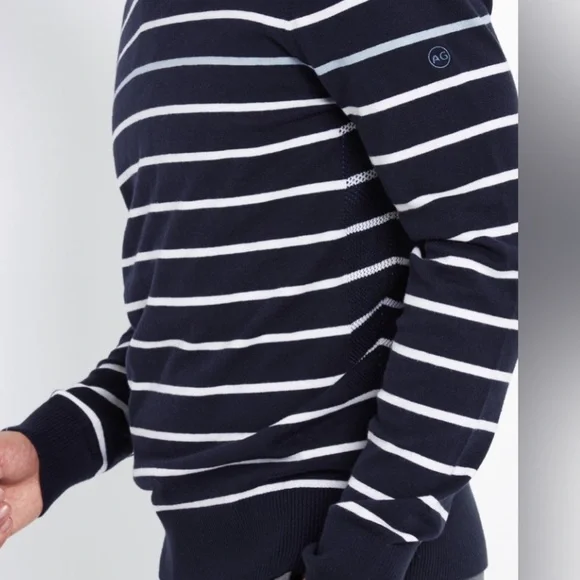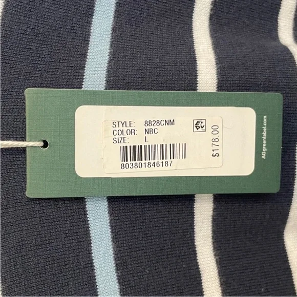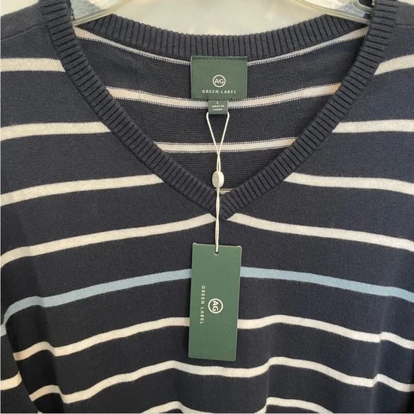 Brand: AG Adriano GoldschmiedLine: AG Green Label – sustainable & eco-conscious lineStyle Name: Farrell Stripe V-neck Size: Men’s LargeColor: Navy with white and slate blue stripesCondition: New with tags (NWT)Material: 95% Cotton + 5 %Cashmere Made in PeruPart of AG’s Green Label collection, this lightweight V-neck sweater blends effortless polish with thoughtful design. Crafted from a soft luxurious cotton and cashmere blend defines this nautical stripe pullover featuring a trim silhouette for that modern finish.Mesh-knit ventilated panels run along the underarms and sides for enhanced airflow—perfect for transitional weather or layering. Finished with a ribbed neckline, cuffs, and hem, plus a tonal AG sleeve logo patch.Features:•AG Green Label – eco-conscious line•V-neckline•Ribbed trim at collar, cuffs, and hem•Mesh ventilated side and underarm panels for comfort•Modern striped design with contrast accent stripe•AG tonal logo patch on left sleeve•Lightweight, breathable cotton knit•New with original tags attachedMeasurements (Approximate, Flat Lay):•Chest (Pit to Pit): 22.5” (45” total)•Length (Shoulder to Hem): 27”A versatile piece for smart-casual styling. Ships fast from a smoke-free home.