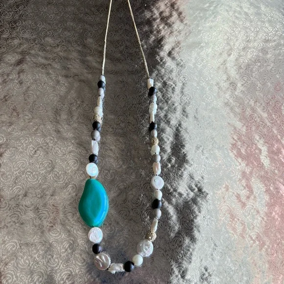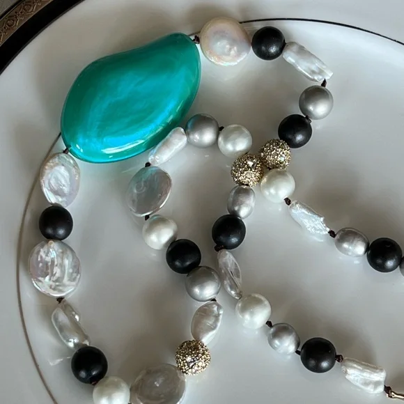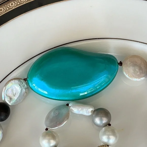Such a beautiful necklace! Hard to find. The turquoise color lucite piece is gorgeous and obviously the focal point of the necklace. Lobster clasp closure with AB. Guaranteed authentic. Worn a few times. In excellent condition. It’s hard to part with it but it is time to downsize my collection. Box and dust pouch included. I welcome reasonable offers. Thanks for taking a look! 😊