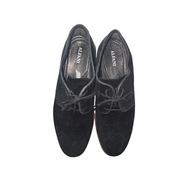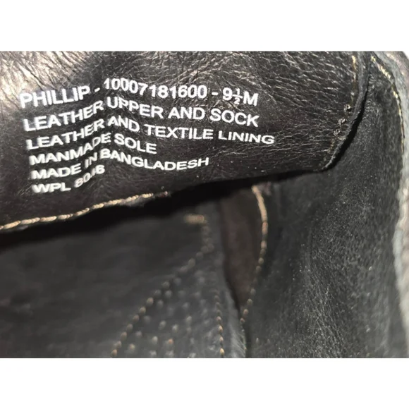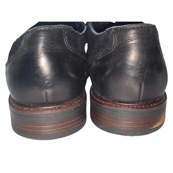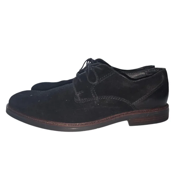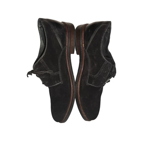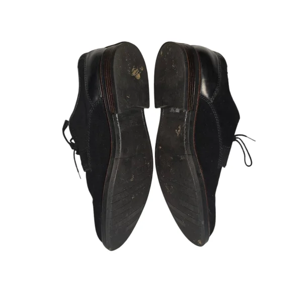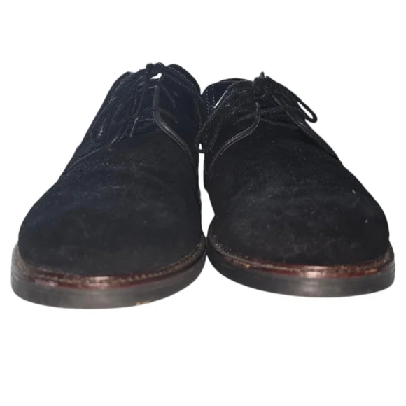 Pre-owned black suede lace-up dress shoes by Phillip. The shoes are size 9.5M and have a leather upper and sock, textile lining, and a man-made sole. The shoes are made in Bangladesh. The shoes have a brown leather trim around the sole and a black leather heel. The shoes have some wear and tear on the soles and some scuffs on the suede. The shoes are in good condition overall.