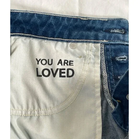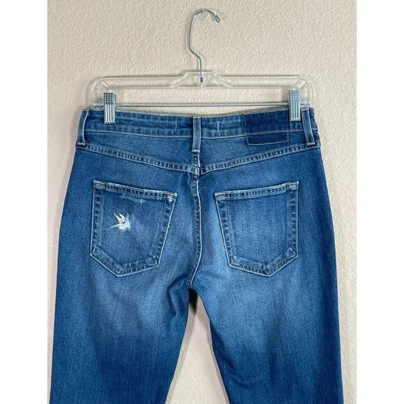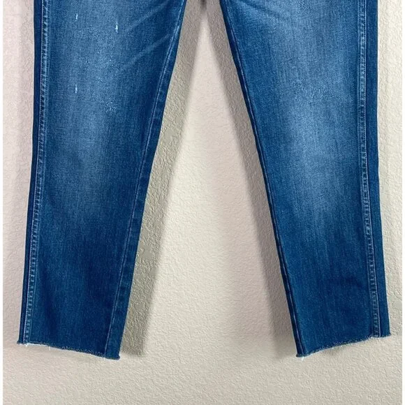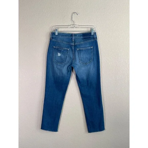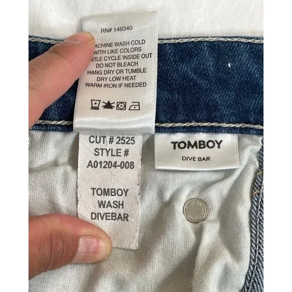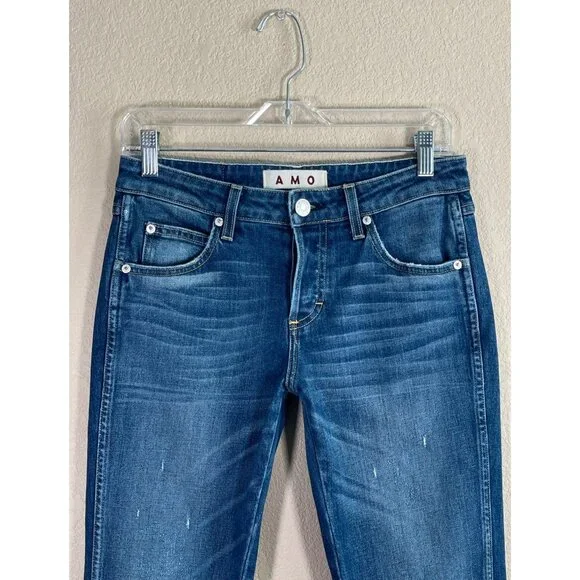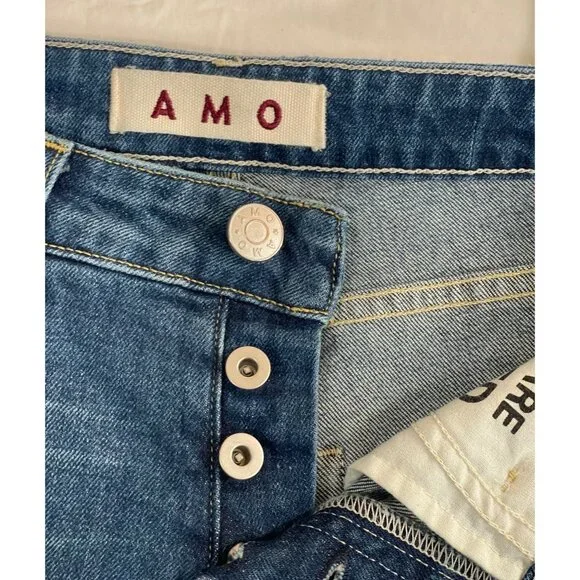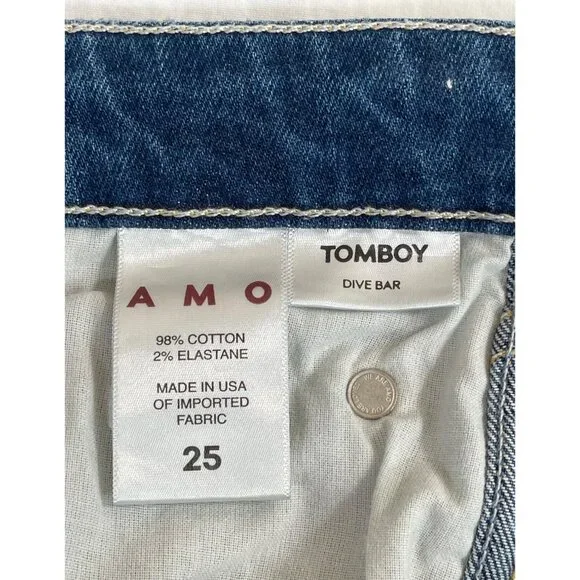 AMO Denim Women's TOMBOY Crop Button Fly Raw hem ~ Dive Bar Wash Style# A01204-0085-Pocket boyfriend jean in a vintage-inspired, mid-blue wash with slight distressing at the thighs. Features a slightly tapered leg, relaxed rise, contrast gold stitching and button fly closure.Made in USASize 25Waist: 14.5" Flat acrossRise: 8.75"Inseam: 25"Great pre-owned condition!SKU# 0036