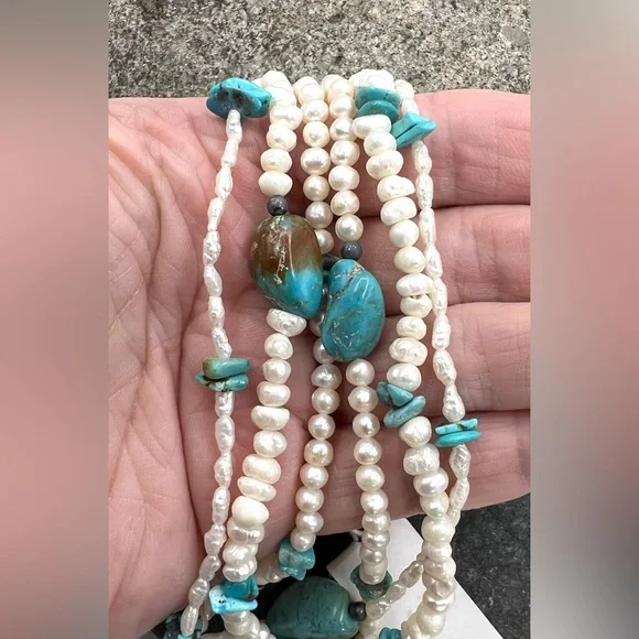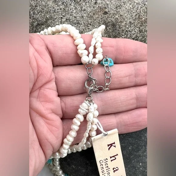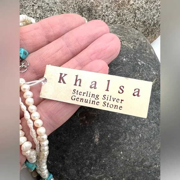 Ananda Khalsa Sterling Natural Turquoise And Pearl Multi Strand Beaded NecklaceOrders totaling $100 and up include an anti-tarnish treated velvet jewelry pouch!The necklace measures approximately 18" with a 2" extender to finish at 20"The beads range in size from approximately 2mm to 11mm Total weight is approximately 36 GramsCondition: NewMetal: Sterling Silver Stamped 925 on claspComes in a gift box!
