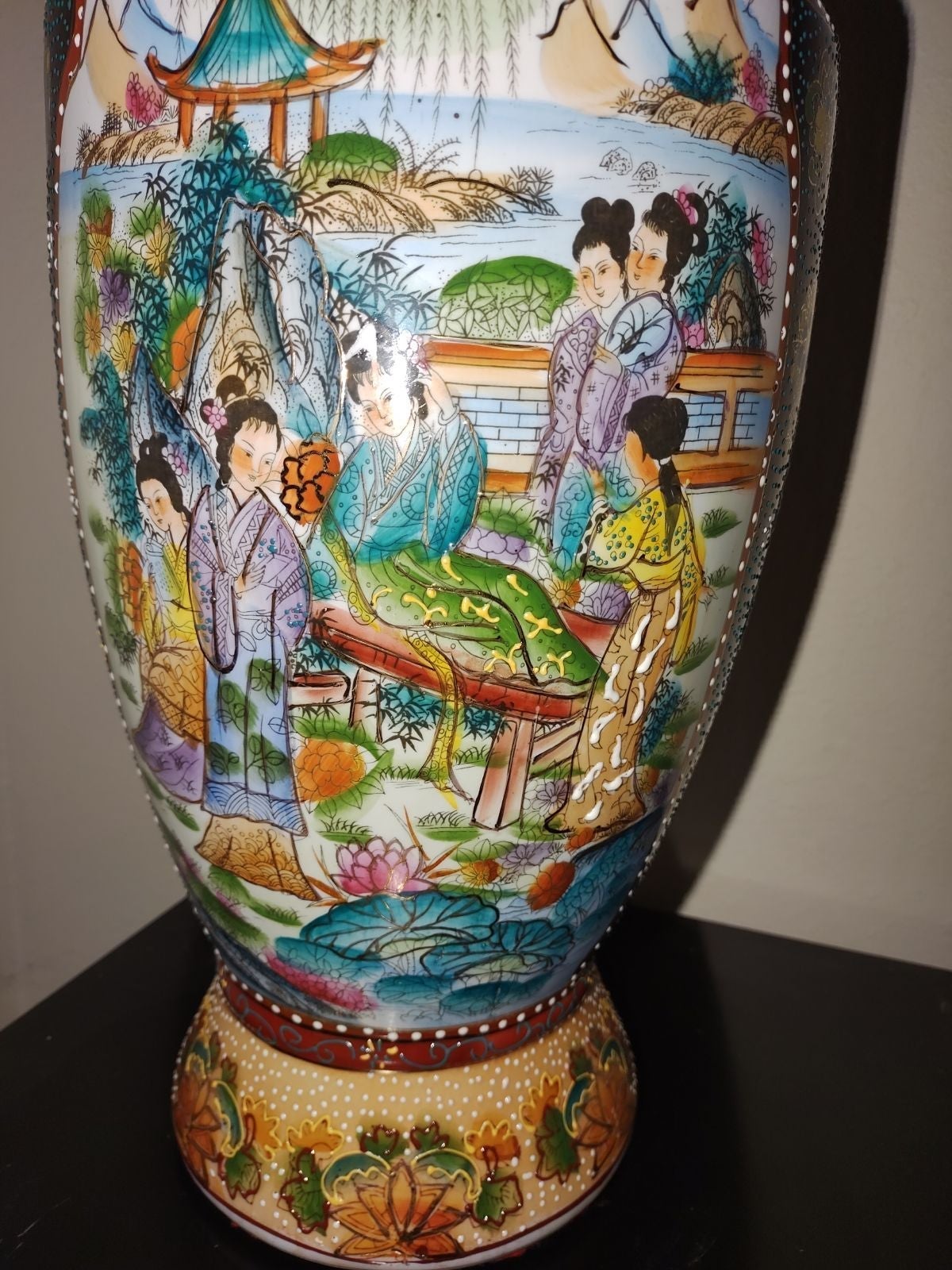 Antique 24" Japanese Satsuma Vase/Urn in excellent condition with ornate handcrafted details and gold accented handles. Gold and floral trim that features Geisha ladies with stunning landscape pictured here. Each vase is unique.