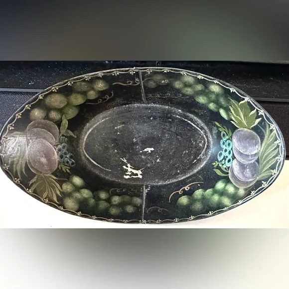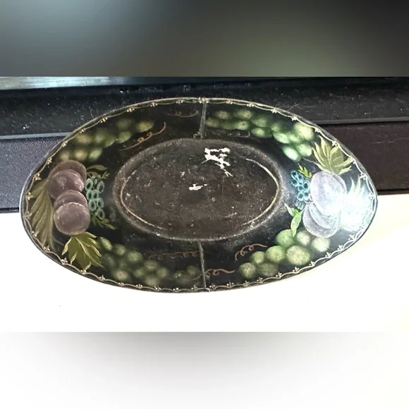 Antique Hand Painted 1800's Small Metal Toleware Tray Trinket Dish Black Signed Elizabeth Klein Grape Vine Plums OOAKEarly 1800's Vanity Dresser Tray With Rising End Edges.Artistry on edges.Lovely unique one of a kind. Highly collectible.Even the artist's signature is charming.Perfect gift for collector of antique toleware or oenophile wine fan.Approximate Dimensions:6" Length x 3.75" Width x 1.75" HeightAntique Small Metal Floral Toleware Dresser Tray With Curved Edges Charming vintage oval shape with fruit design. Features green, blue purple, and black tones.Antique Hand Painted Handcrafted Toleware Signed Fruits Plums Grapes Cottagecore Americana Folk Art OOAKPerfect to use as a hostess gift or to hold guest soaps, keys, candles, jewelry
