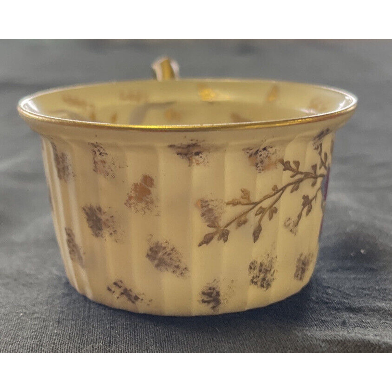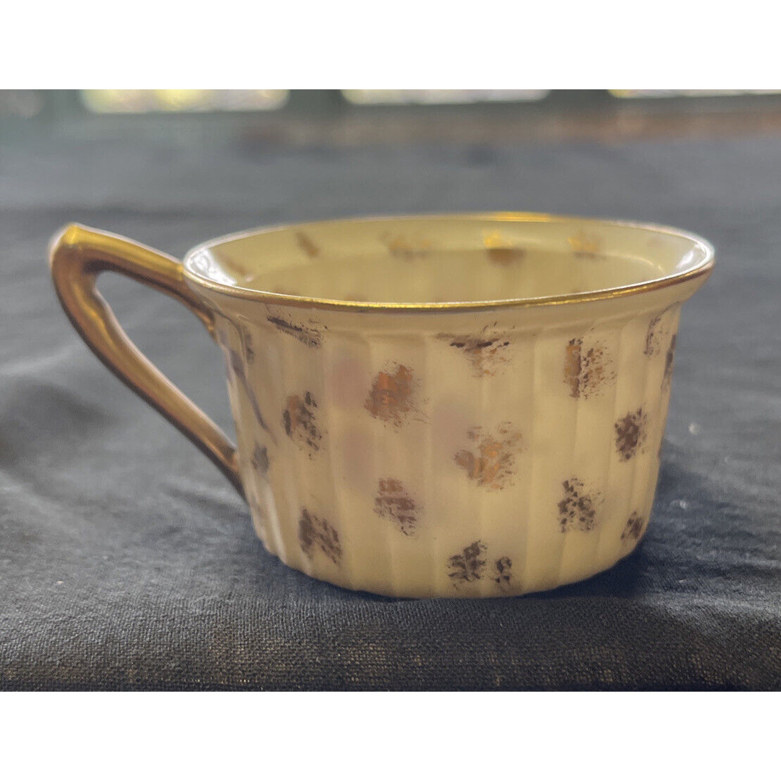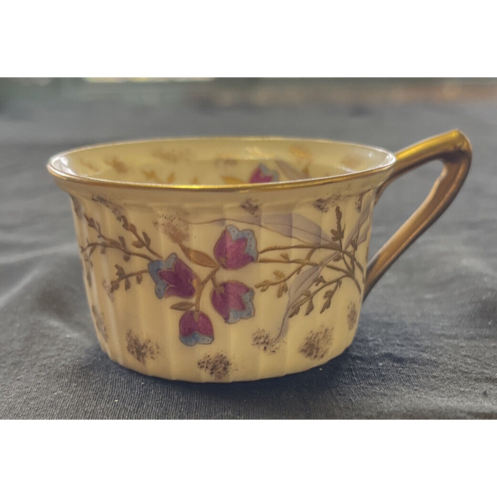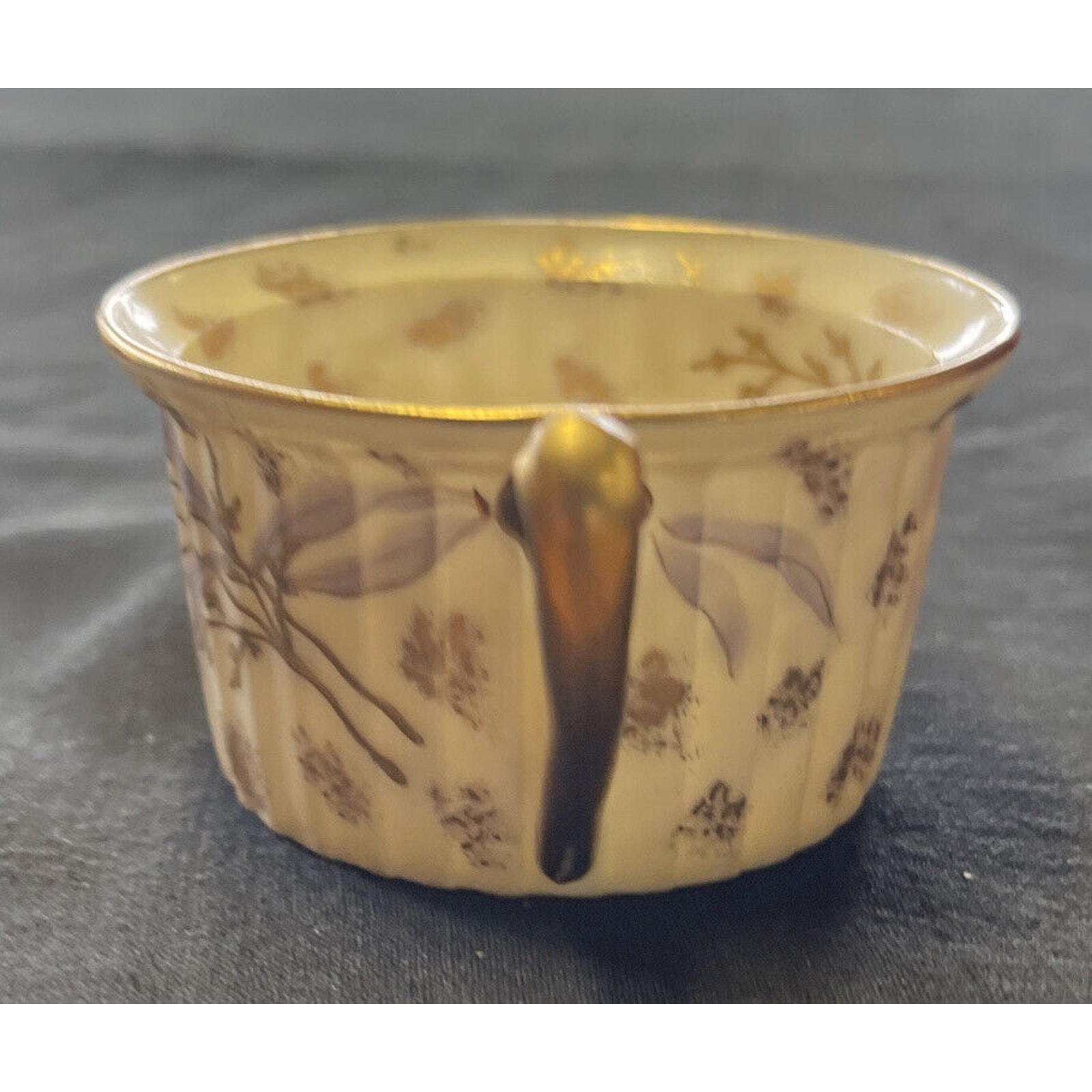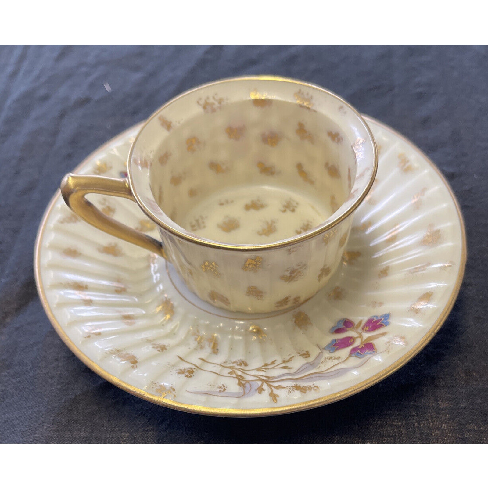 Antique Marx & Gutherz Gilded Demitasse Cup and Saucer, dating between 1876 and 1889, exudes opulence with its delicate floral pattern and ornate gold trim. The demitasse cup stands 1.25 inches tall, with diameters of 2 inches at the bottom and 2.725 inches at the top. The saucer, boasting a diameter of 4.5 inches and a height of 0.75 inches, complements the cup with its matching gilded design. The cup features a hand-written marking "2349" with a "9" underneath, while the saucer's overglaze backstamp adds to its authenticity and historical appeal. This set exemplifies the meticulous craftsmanship of the late 19th century, making it a prized addition to any antique porcelain collection.