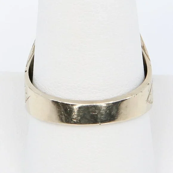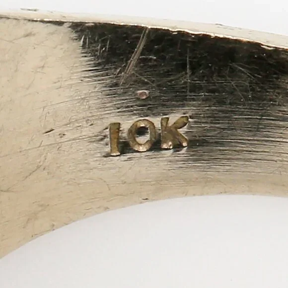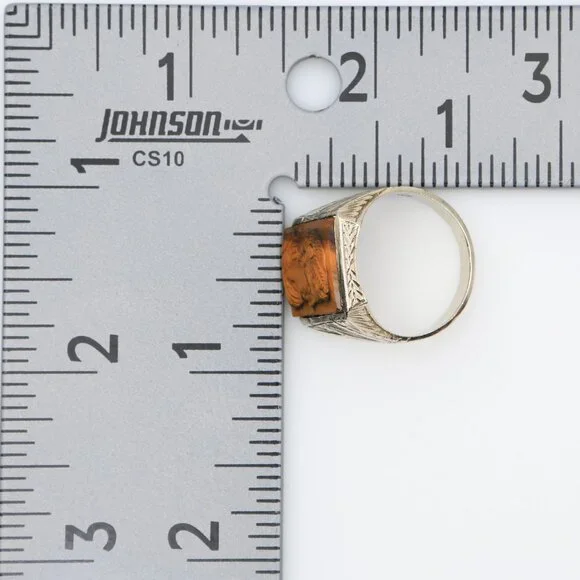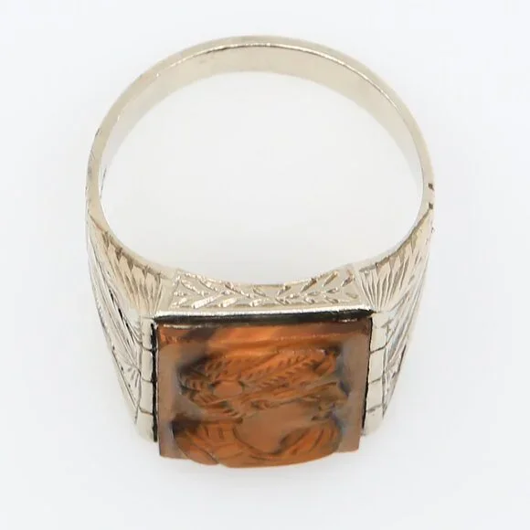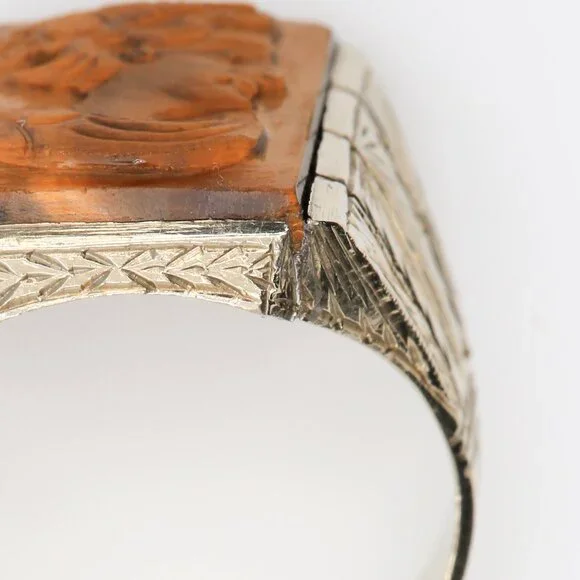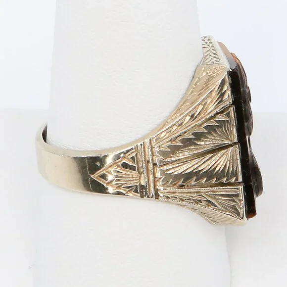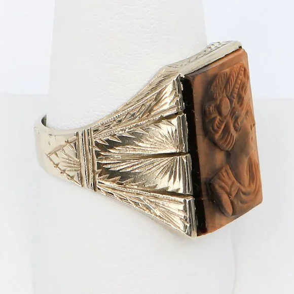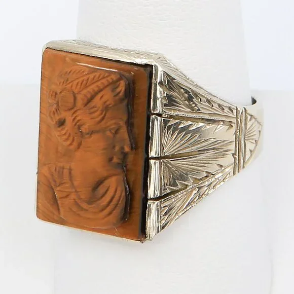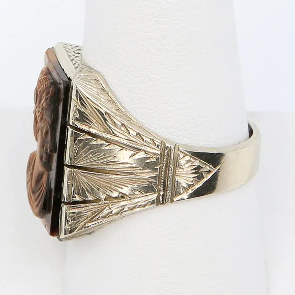 Beautiful antique Victorian 10K gold carved tiger eye cameo ring, gorgeous dark honey colored carved cameo of a woman with a strong Greek profile, wavy hair held by a stylized leaf hair accessory and wearing a draped tunic. The curved, linear design of the tiger eye adds dimension to the carved woman’s face. The cameo is set in a 10K white gold ring band with hand carved leaves on the shoulders and a lovely geometric design on the top and bottom of the setting. The ring is marked 10K on the inside of the band. Details:- Marks: 10K- Color: Silver, dark honey- Materials: 10K white gold, tiger eye gemstone- Dimensions: Size 9 ¼, 5.81 grams- Condition: Very good, the gold setting has a crack in the bottom right corner (see photos)Gold and silver are tested using appropriate jewelry acid testing solutions and a touch stone; acid is never placed on the jewelry.Since our items are vintage/antique, they may show wear from normal use. The product is sold as is; there are no major flaws unless noted. Please examine all photos carefully, and message me with any questions you may have. You will receive the exact item shown in the photo. The photography props used to display the item are not included.