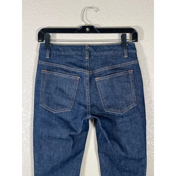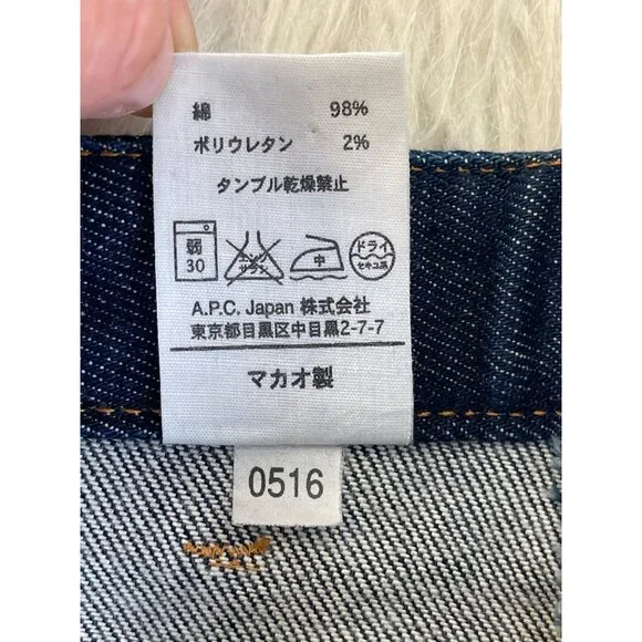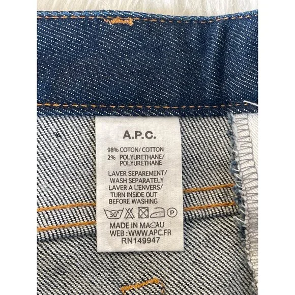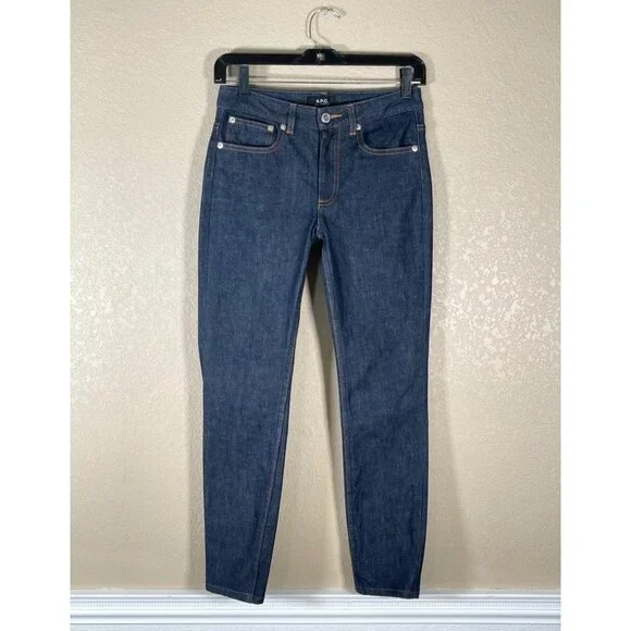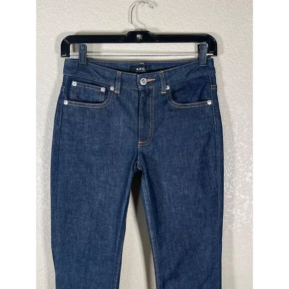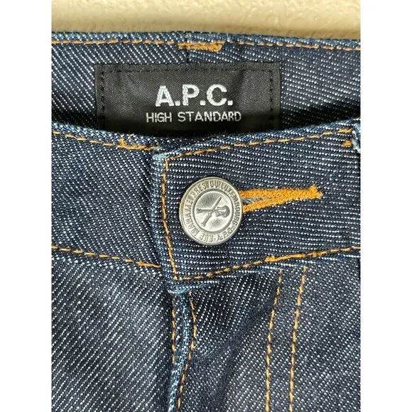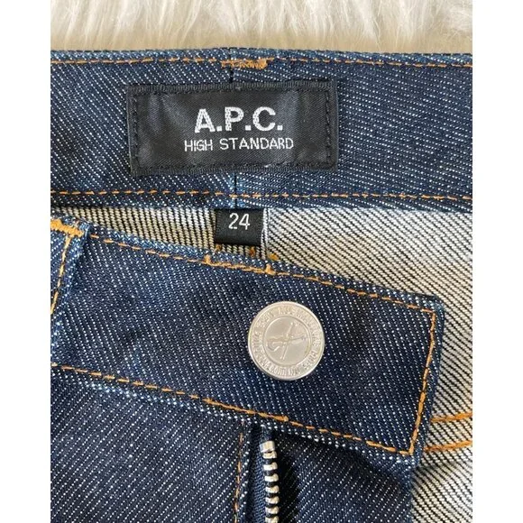 A.P.C. Japanese Denim High Standard Cropped Jeans Dark Indigo These iconic jeans sport a rigid feel that will soften with wear!5-Pocket constructionMid rise Cropped Japanese rigid denim material Zip fly and button closureOrange topstitchingMachine washSize 24 Waist: 13.25"Hips: 16"Rise: 8.5"Inseam: 26"Note: Measurements are taken with the garment laying flat and are approximate. Please compare these measurements to a similar item that fits you well to ensure a proper fit. Fabric Content: 98% Cotton & 2% PolyurethaneGreat pre-owned condition! ~ Gently worn!