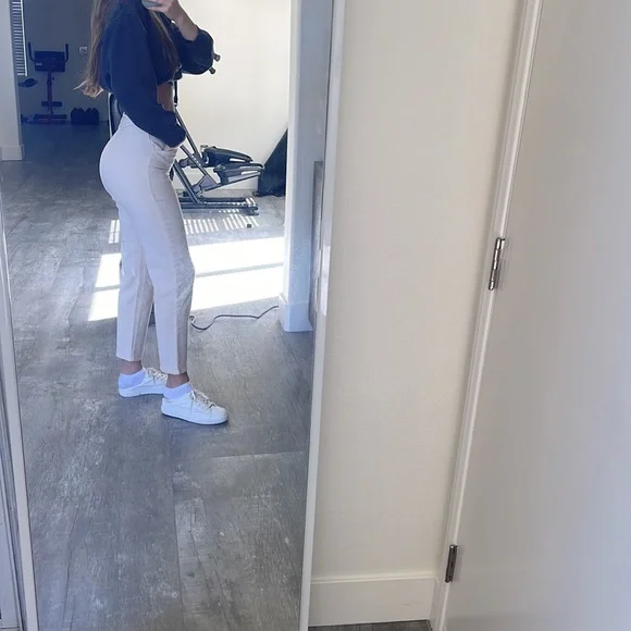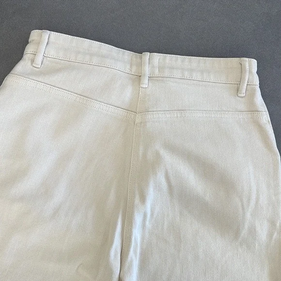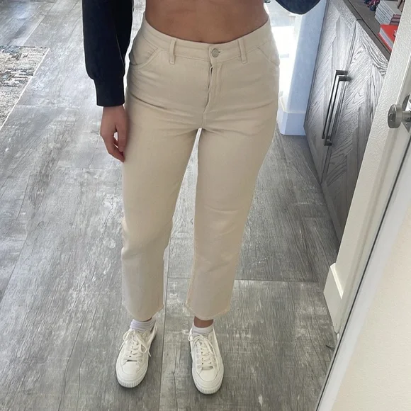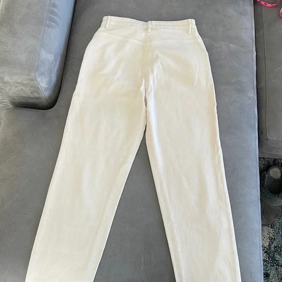 Aritzia Wilfree Free Cream Color DenimVery soft denim97% cotton, 2% polyester, 1% elastaneWaist 13.5”Rise front 12”, back 14”Inseam 28”Worn twice, they have 3 little spots as shown in photo. I haven’t tried to wash them to see it they came off. Barely noticable.