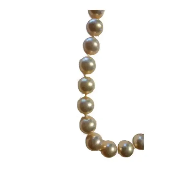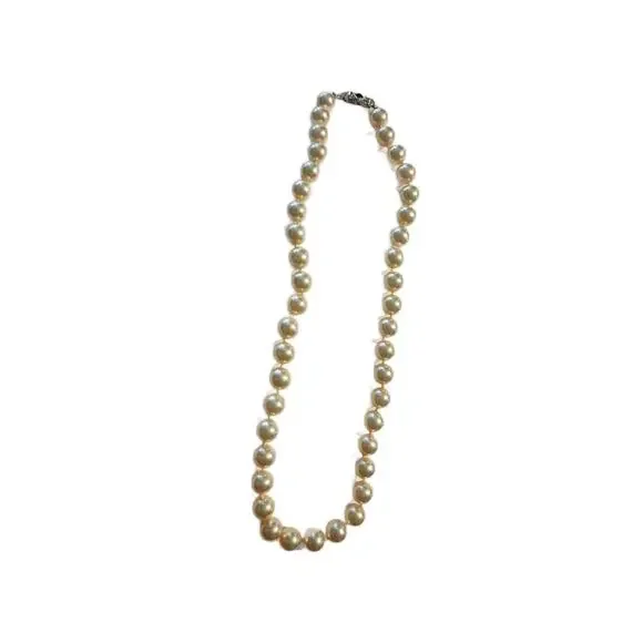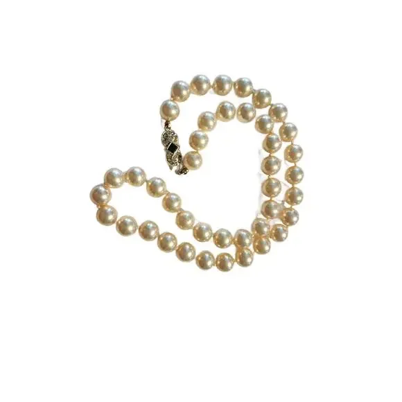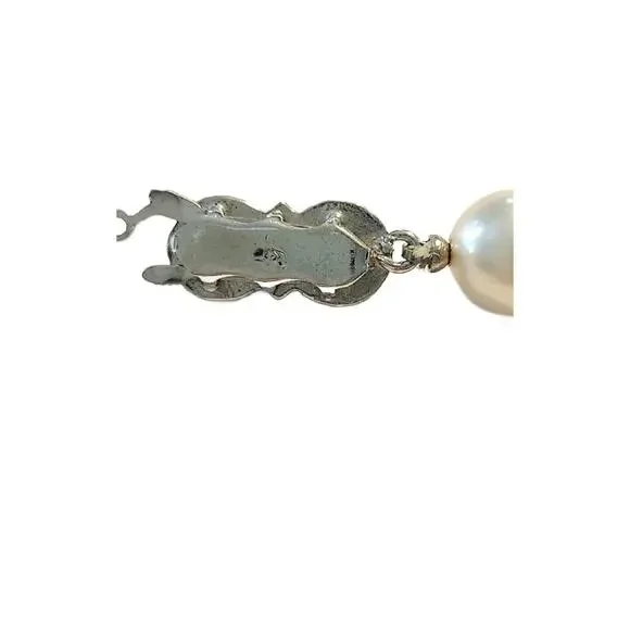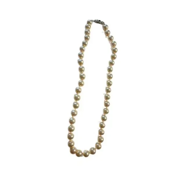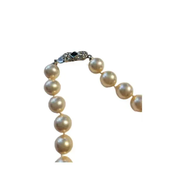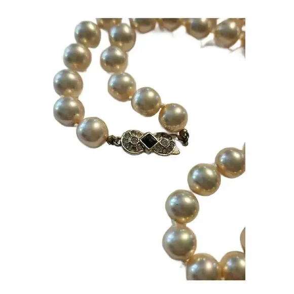 Art Deco Cultured Pearls Necklace with Clasp in Diamonds Emerald and 18k White Gold, 1930s16" L Double Knotted Excellent Vintage Condition
