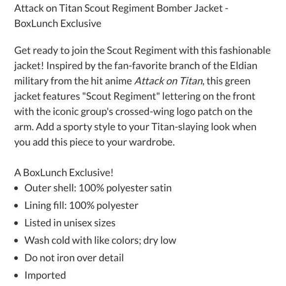 Attack on Titan Scout Regiment Bomber Jacket Box Lunch Exclusive size M NWT