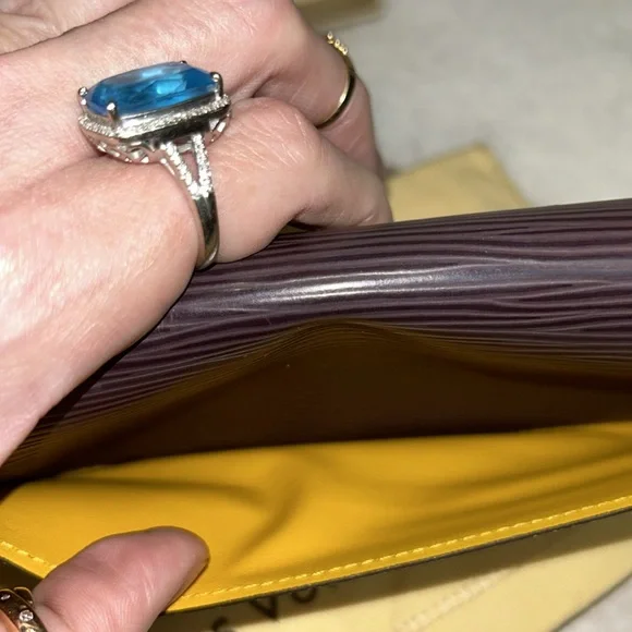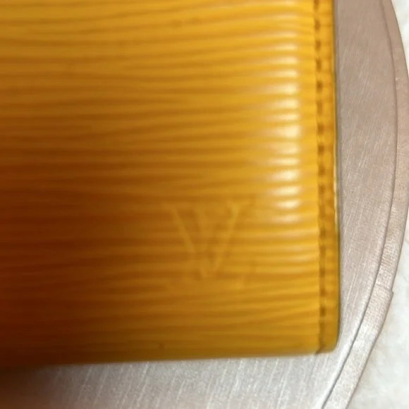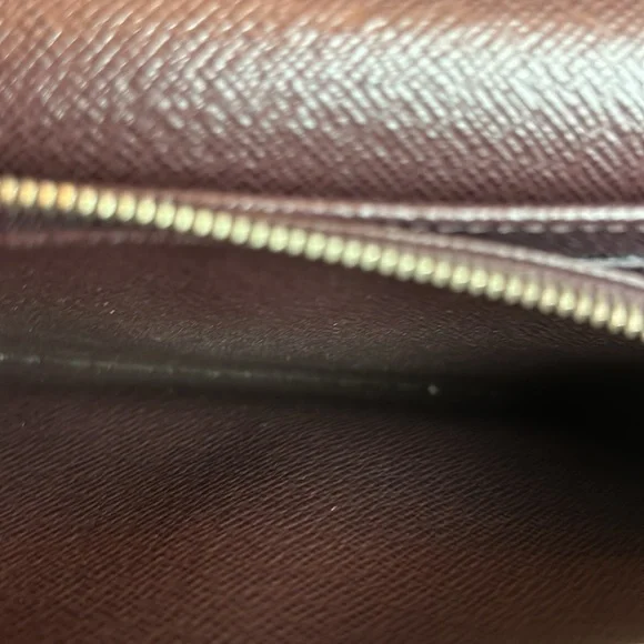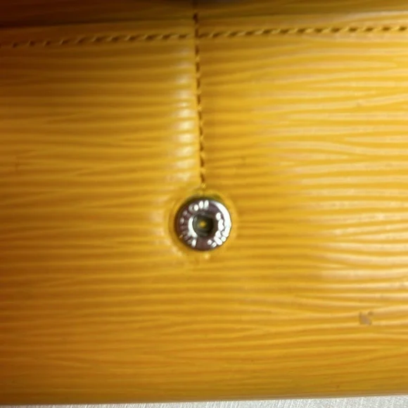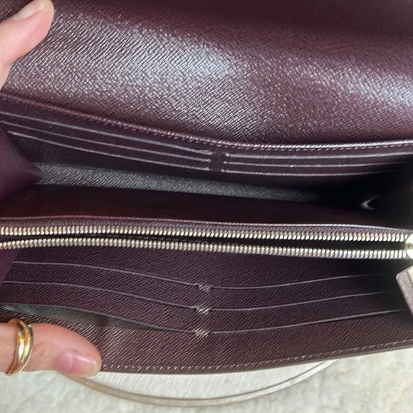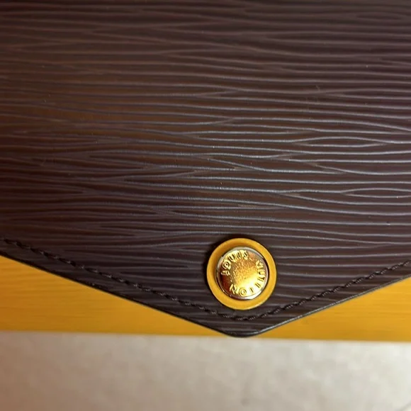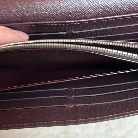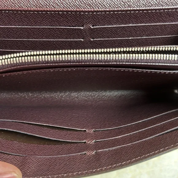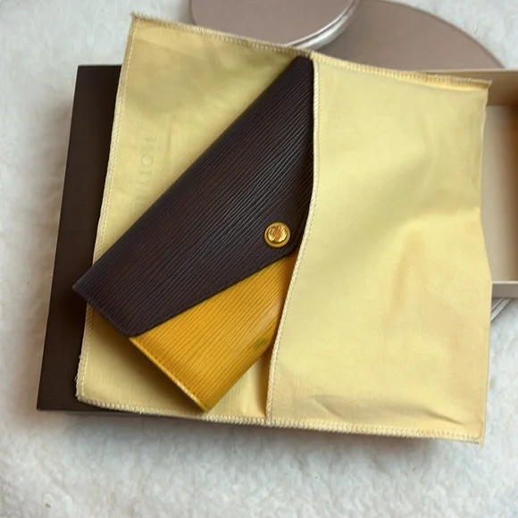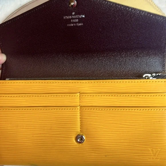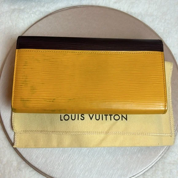 This product is an authentic Louis Vuitton clutch wallet made of leather in a maroon and yellow color scheme. It features various compartments such as credit card slots, a checkbook holder, and a folding section for cash. The wallet comes in one size, measuring 7.5" x 4.5" x 1.25", and includes a gift box and dust bag, making it a stylish and practical accessory for women looking to showcase their luxury fashion sense. Comes with box and dust cover cloth