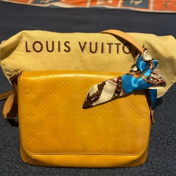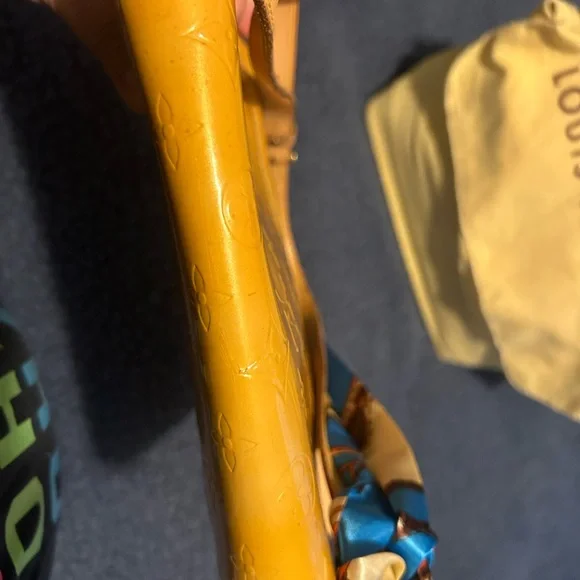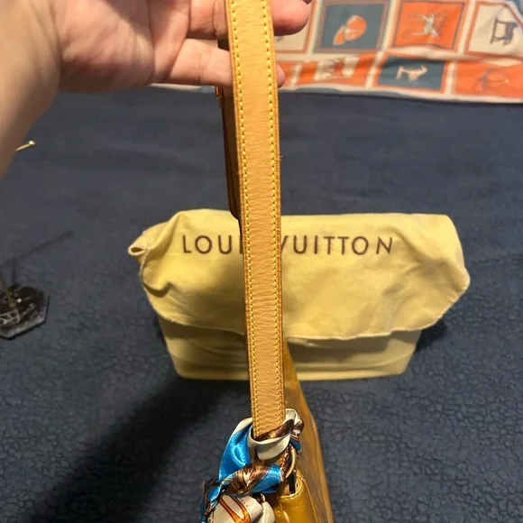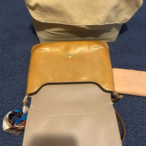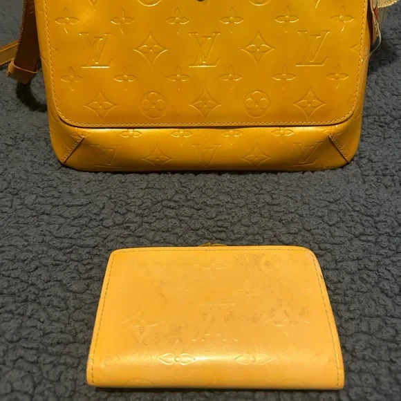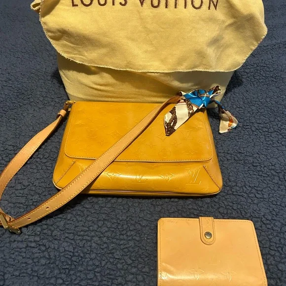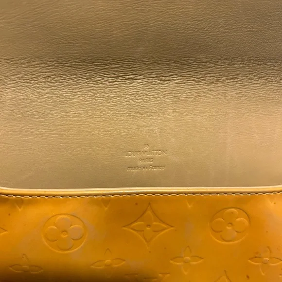Well loved authentic lv vernis yellow gold bag & free lv kiss lock wallet. 1 main flaw is only that dot on the upper left side of the bag some spot on the back & a lil on top but not too obvious, handle is in pristine condition, no cracking & water mark. Free Lv kiss lock wallet has a little bit of color transfer on the outside. Comes with lv dustbag