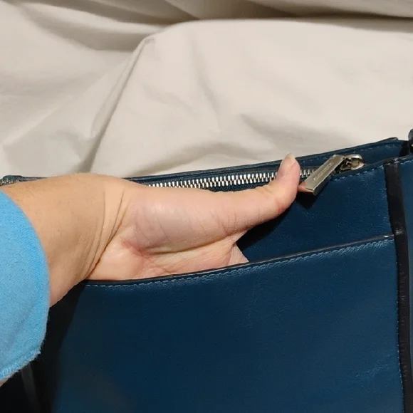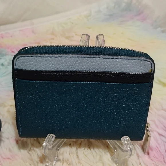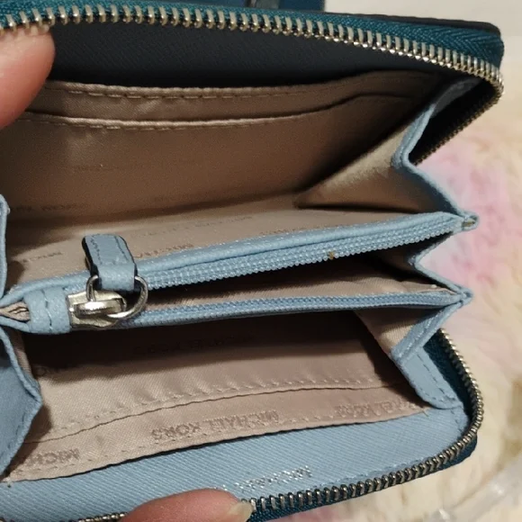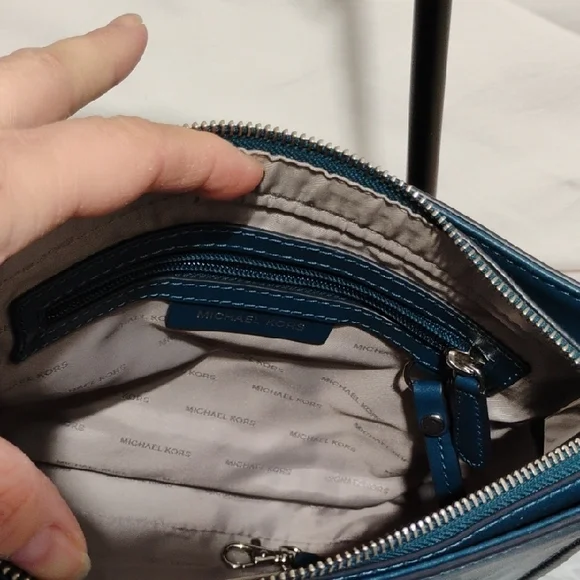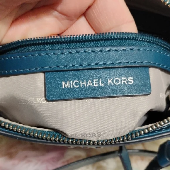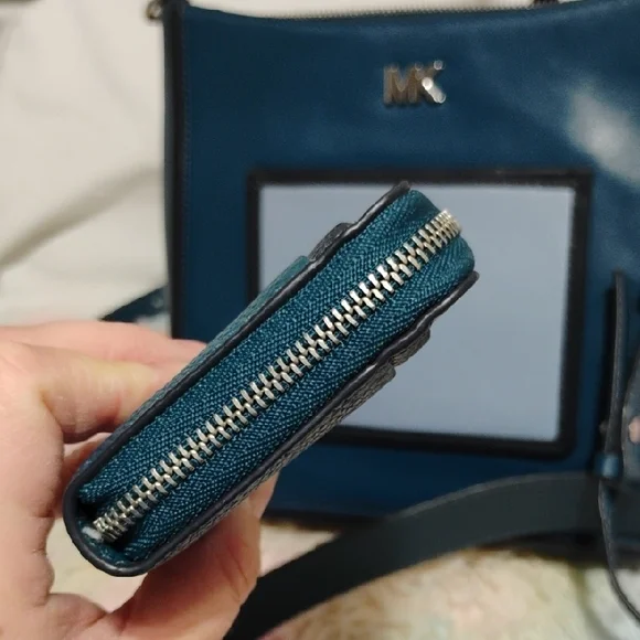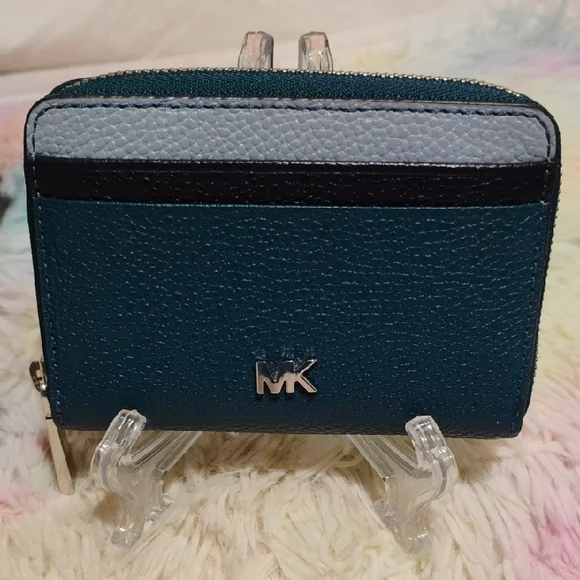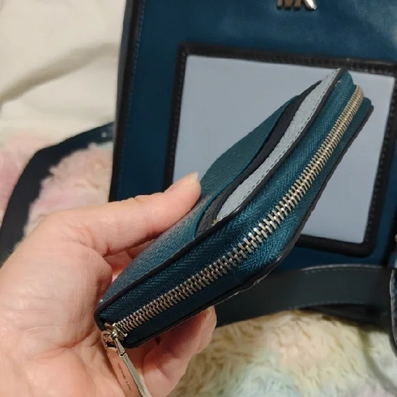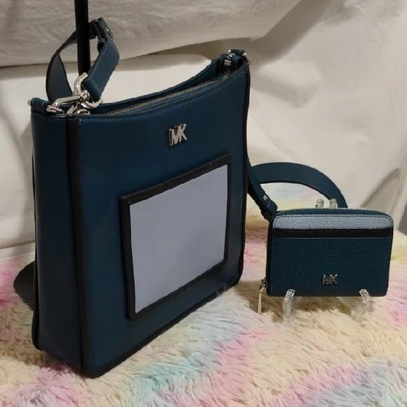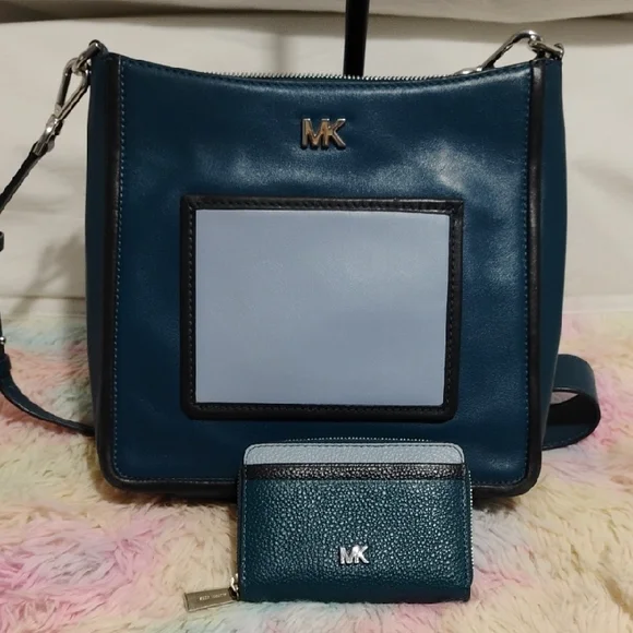 Authentic Michael Kors Gloria Tri Color Bag and matching wallet set! Stylish and versatile, this Michael Kors bag set features a chic blue and gray design. Perfect for any occasion, it combines elegance with functionality. Gently used! Silver hardware, zipper closure for both, front open pocket and back pocket on bag, zipper pocket inside bag! Wallet Has 2 open card front pockets and 2 back open card pockets! Inside has 4 card slots and a small zipper pocket! Gently used items so may have some small signs of use like rubbing on corners but no rips or damage! Measurements Of Bag: Height: 9".Width: 9 1/2".Strap Drop: 23", Removable & Adjustable!Smoke and pet free home! Reasonable offers always welcome!