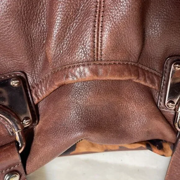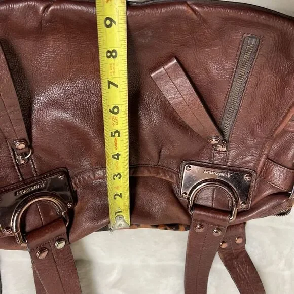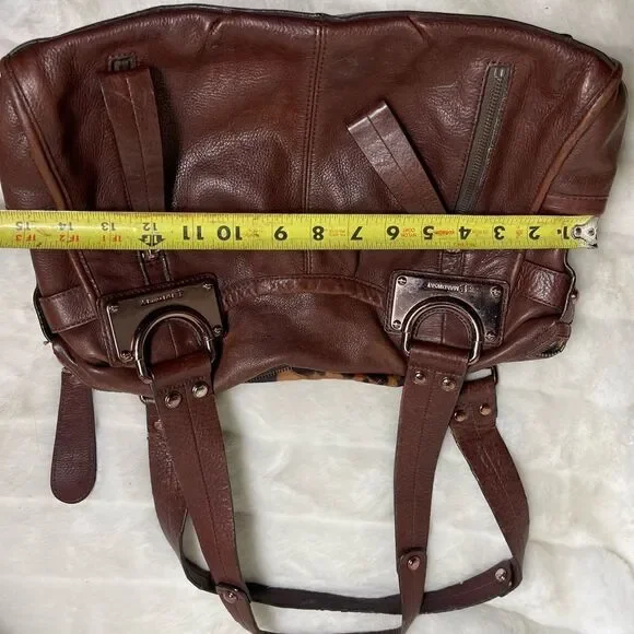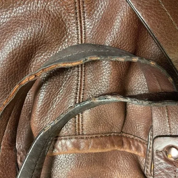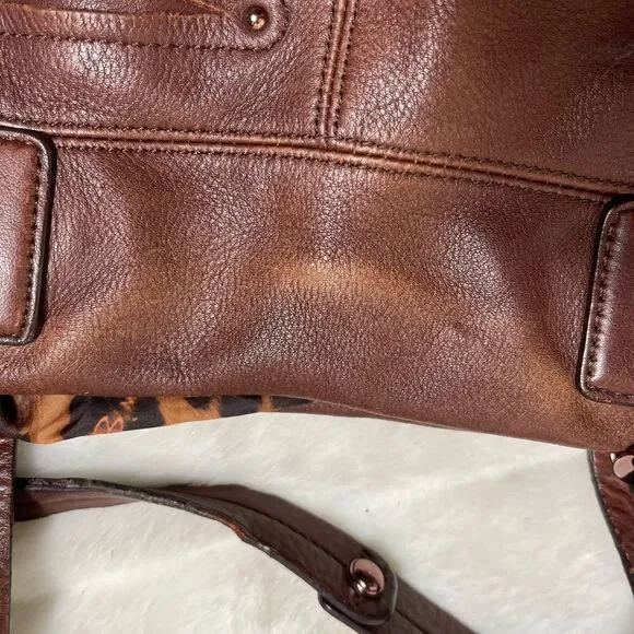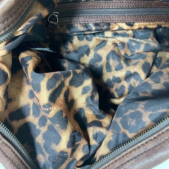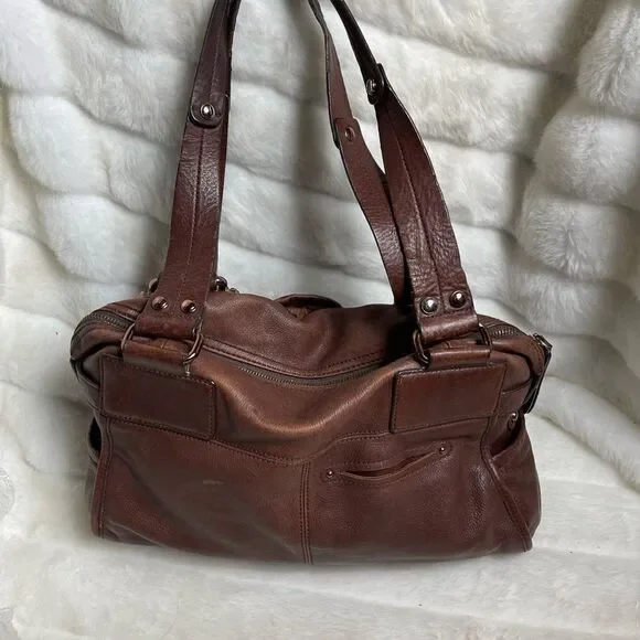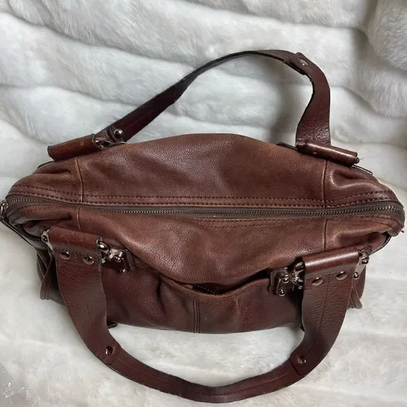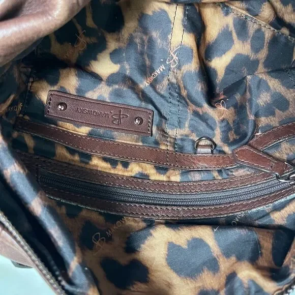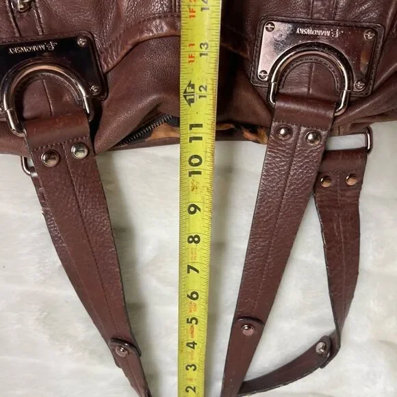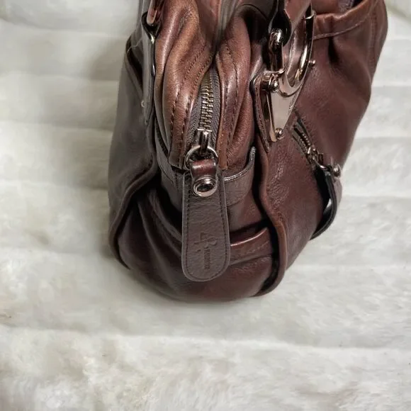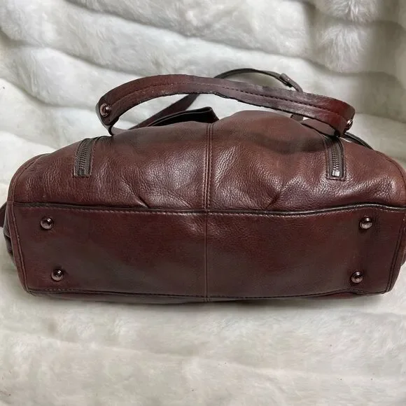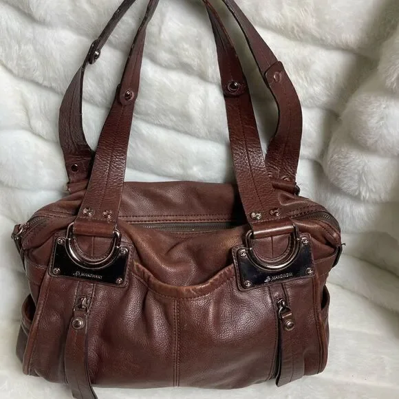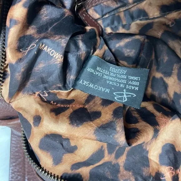 B Makowsky leather Brown medium shoulder bag with rose gold accents & hardwares front pocket back small pocket two side pockets top zipper closure the inside lining has a side zipper two side pockets pre owned in good used condition signs of wear on the leather and on the straps see all pictures any questions please message. E10