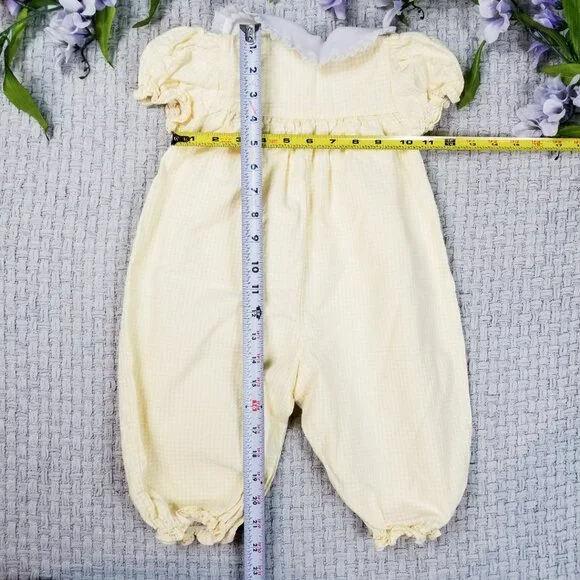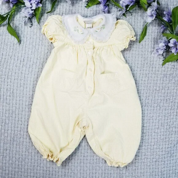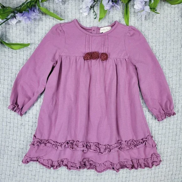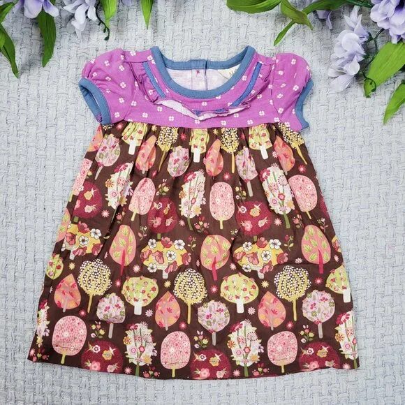 Bundle includes five outfits: Matilda Jane purple & brown floral dress, size 6-12m; Matilda Jane long sleeve purple dress w/ roses on chest, size 18-24m; Penelope Plumm floral striped fox romper/layette, size 6m; vintage B.T. Kids yellow/white gingham ruffled romper w/ embroidered floral collar, size 12m; and Gymboree two piece dinosaur pajama set, size 12-18m. All are in very good gently used condition - no rips, stains, or flaws, mild wear.