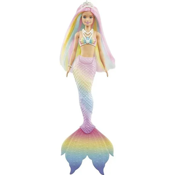 CottonBring a fantastical color-change transformation to playtime with Barbie Dreamtopia Rainbow Magic Mermaid doll!Barbie mermaid doll features a neon-bright fantasy look with a tiara in her rainbow hair, a multi-colored tail and a bodice with sea-inspired accents.Dip Barbie doll in warm water to see her hair, bodice and tail instantly transform to reveal a rainbow of pretty pastels!Dip her in ice-cold water to see her change back to her original neon-bright look and relive the transformation again and again.Fairytale lovers will have so much fun transforming Barbie doll's look and taking her on enchanted undersea adventures!