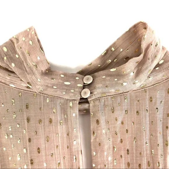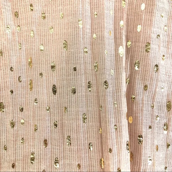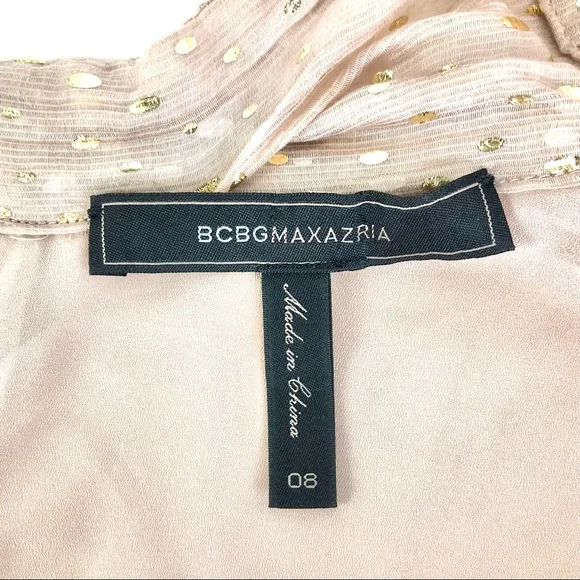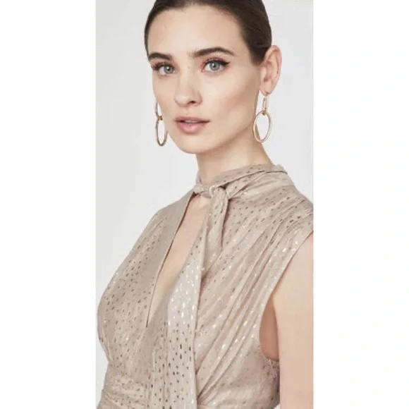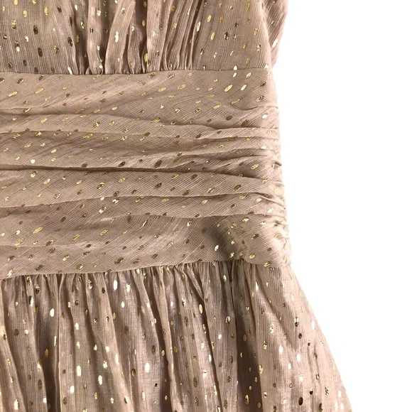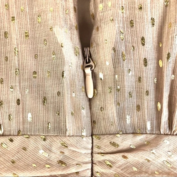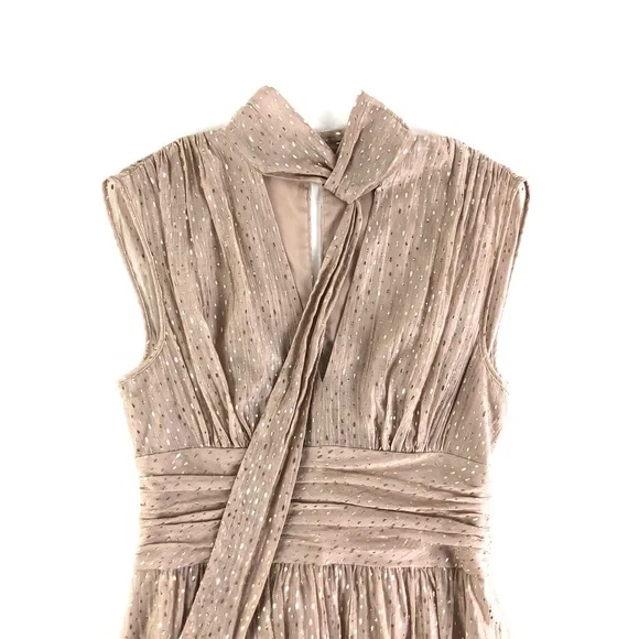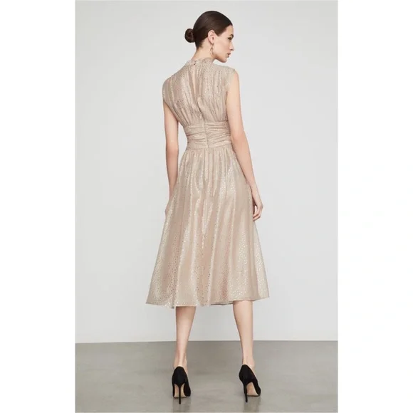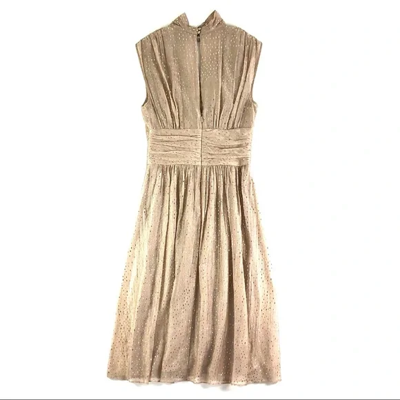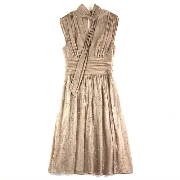 Perfect condition BCBGMAXAZRIA brand dress. Women’s size 8. 51” length. 16” pit to pit. 70% tencel, 30% nylons. Sheer like fabric. Midi length. Past the knees. Mock neckline with wrap scarf design. Sleeveless. V-neck cutout. Ruched waistlines. Pleated skirt. Beautiful cream beige color with metallic gold sheen Swiss dots. Hidden zipper back. High quality. Worn once. Interior is fully lined. Feel free to leave a comment or bundle! Thanks for browsing!