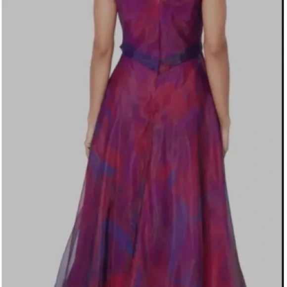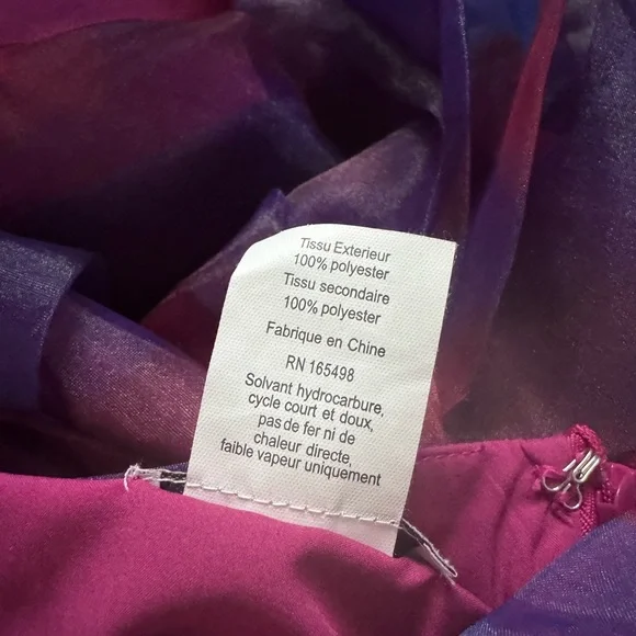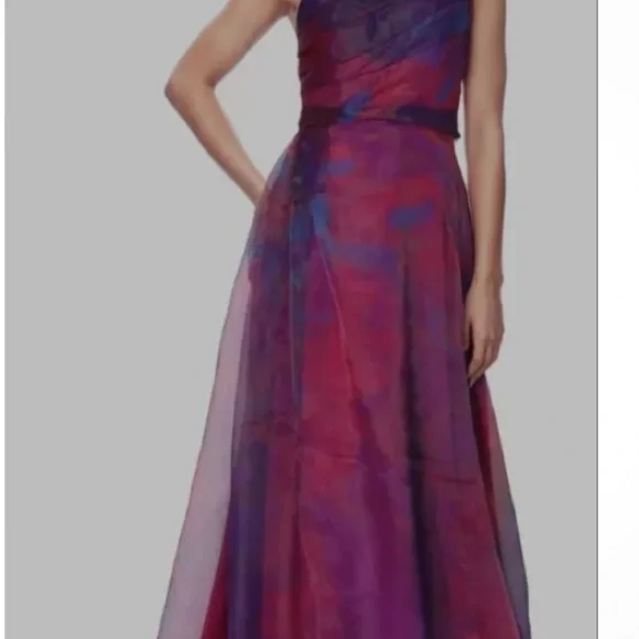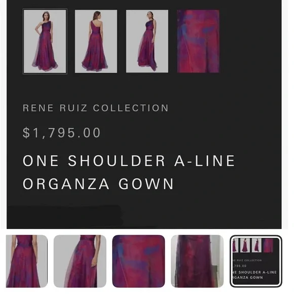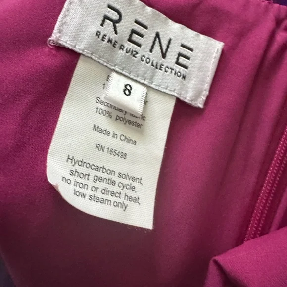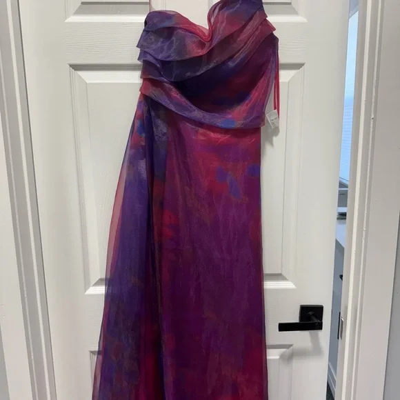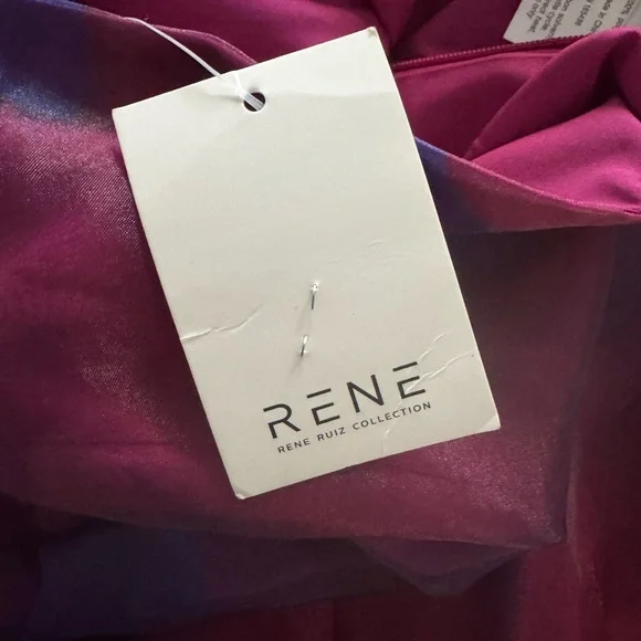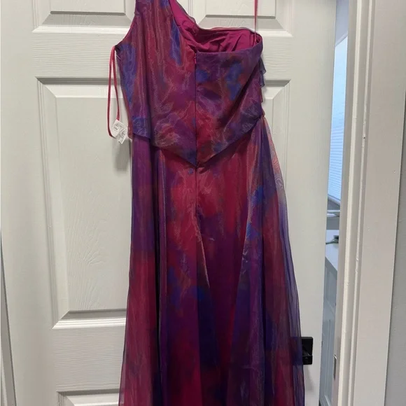 This exquisite gown by Rene Ruiz showcases a captivating blend of red and blue hues, perfect for a prom or cocktail event. The sleeveless design features a one-shoulder neckline, adding a touch of elegance to the flowing maxi silhouette. The lightweight fabric and ethereal layers create a graceful movement, making it a standout piece for any special occasion.Run small more like size 6. I bought it for my daughter’s wedding but ended up wearing a different dress. Hemming done for a 5.2 wearing a 4 inch’s shoes.