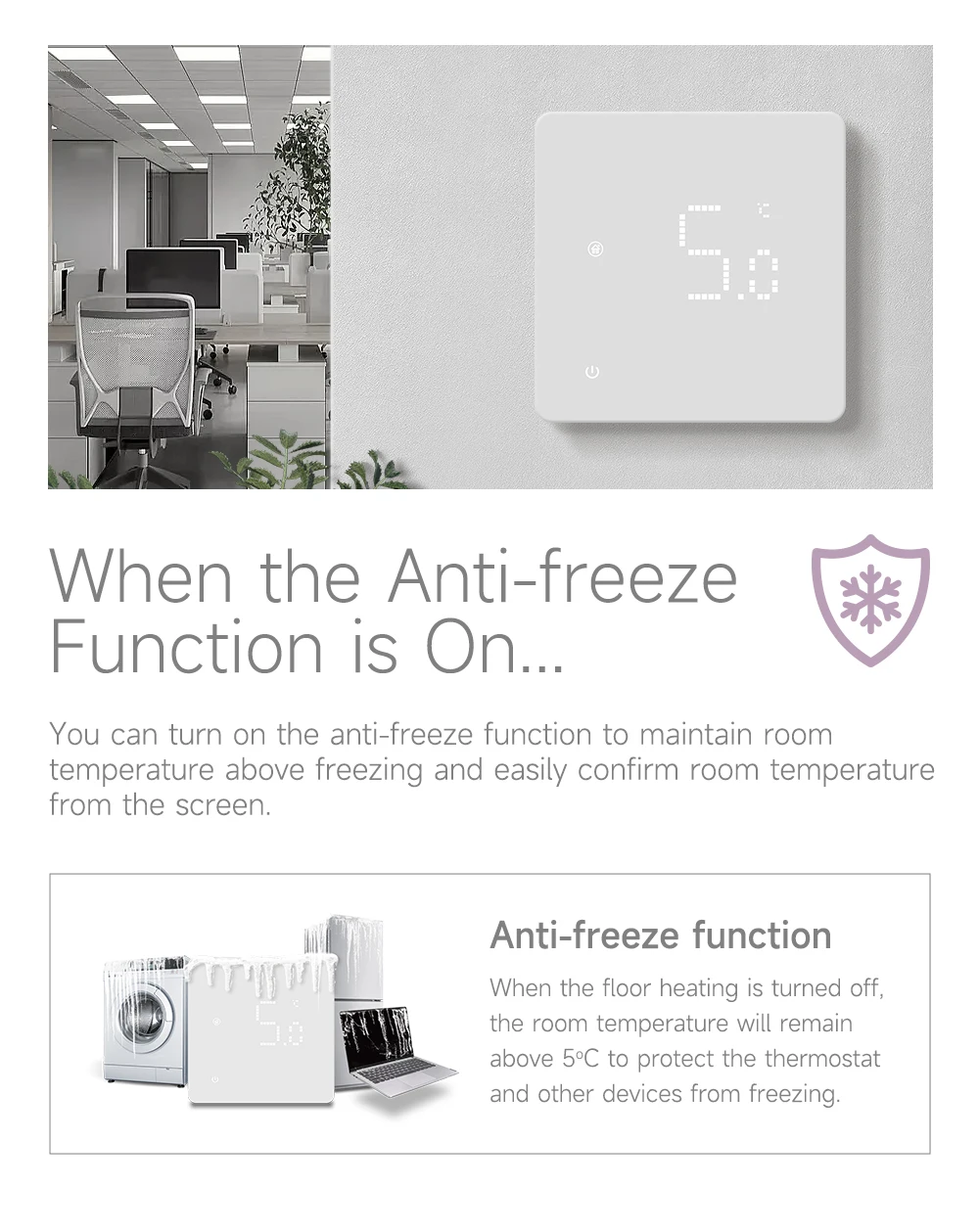 【Antifreeze function】After the antifreeze function is turned on, the power off display screen can also display the temperature of the room, allowing you to know the temperature at any time to prevent indoor equipment from being damaged by freezing.