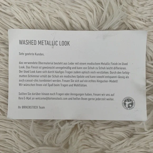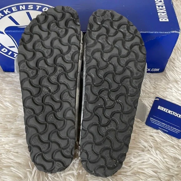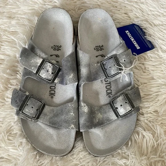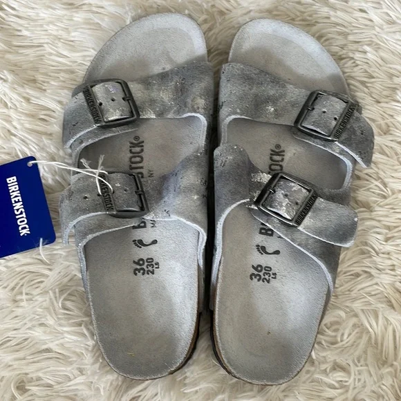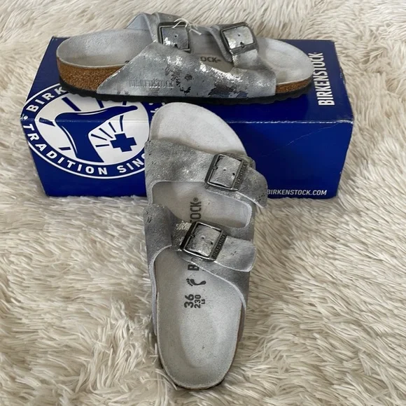 Birkenstock Washed Metallic Cream Gold Suede Leather Arizona Sandals36N Wms 5-5.5 Nar-Wide WidthNew in Box (extra glue on sole, box damaged)Luxurious washed metallic leather with a subtle vintage look that can vary from shoe to shoe. Anatomically correct suede-lined, contoured footbed molds to the shape of the foot. Raised toe bar is designed to encourage the natural gripping motion of your feet. Neutral heel profile and deep heel cup keeps your heel secure while distributing body weight.