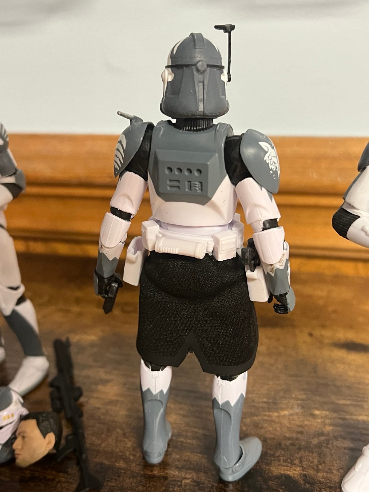 Black series 1/12 scale, the Wolffe includes his head/animated helmet with replaced rangefinder(dosent move), a realistic version of his helmet that is 3d printed, painted and sealed by me. Paint matches the armor, replaced Kama and added a Kama strap. Boost and sinker are the first wave Ali express troopers, I repainted and glossed the visors. Great set, shoot me an offer!