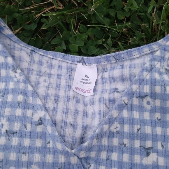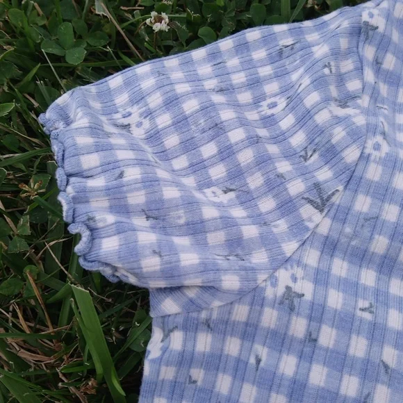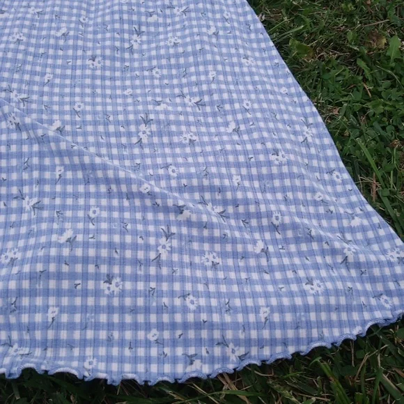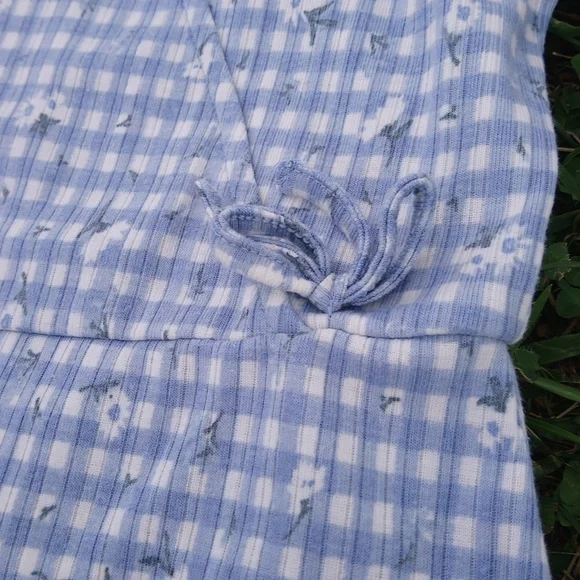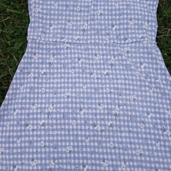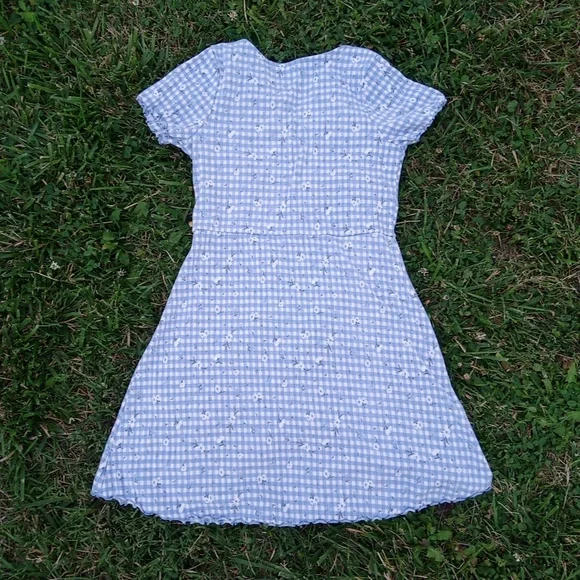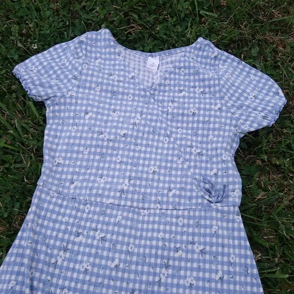 Super cute lightweight blue and white checkered print pattern short sleeve faux wrap style dress with ruffle trim and flowers all over! Great pre-owned condition with lots of life left!💚All offers and questions are welcome!💚🖤Shop! Bundle! Save!🖤🌱At least 2 items = 20%off🌱🍀At least 4 items = 40% off🍀B27