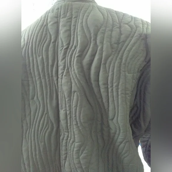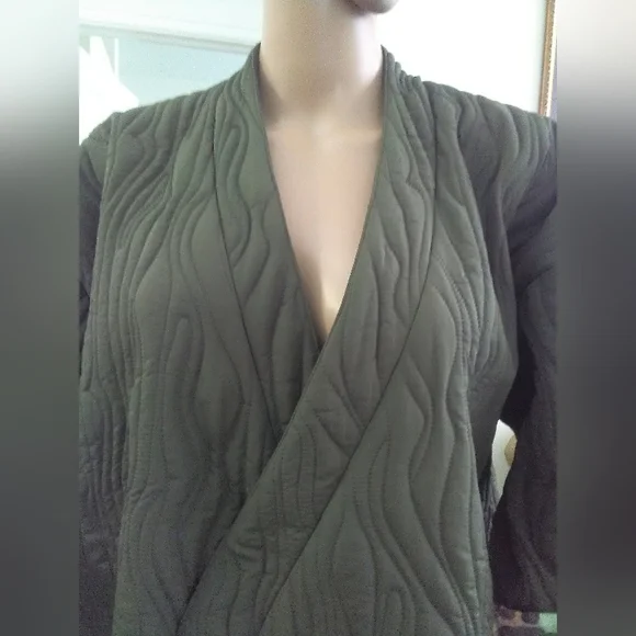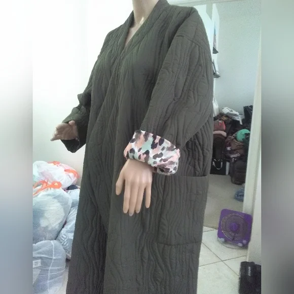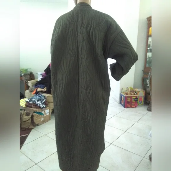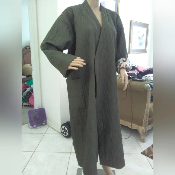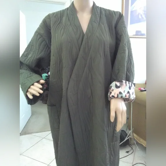 Stylish green quilted long jacket featuring animal print cuffs. Perfect for cozy lounging. THIS BRAND IS JOHNNY WAS . THIS JACKET/ COAT IS FLOOR LENGTH DEPENDING ON YOUR HEIGHT. ITS BEAUTIFULLY QUILTED , ARMY GREEN COLOR. IT HAS NICE BIG POCKETS AND THE ANIMAL PRINT REALLY POPS. I AM NOT SURE IF IT HAD A BELT THAT WAS LOST IN TRANSPORT OR NOT. ADD ONE IF YOU WOULD LIKE.ITS NOT NEARLY AS HEAVY AS IT APPEARS , ITS A LIGHT JACKET, NOT THICK . ITS A COTTON AND POLYESTER, POLYESTER IS RECYCLED, LOVE THAT.PTP 25 EVEN MORE SPACE DUE TO OPENNESS