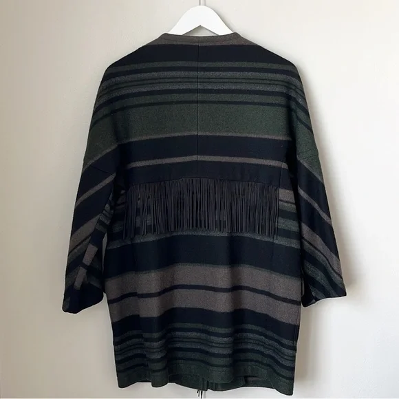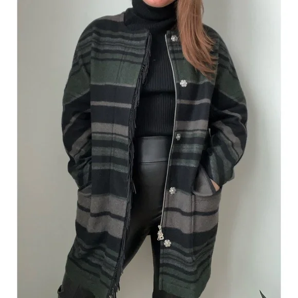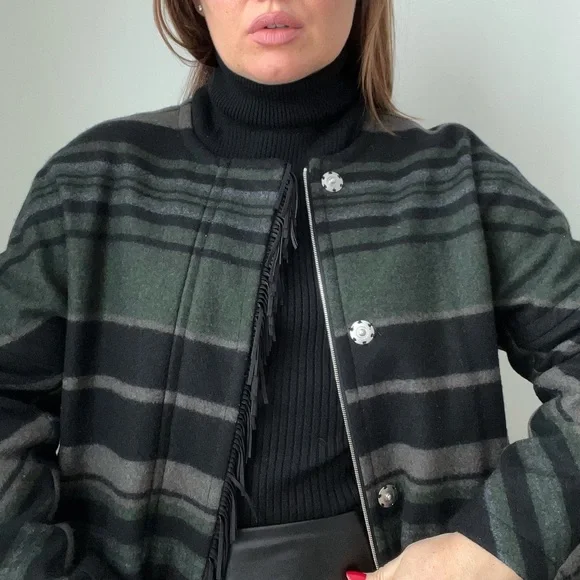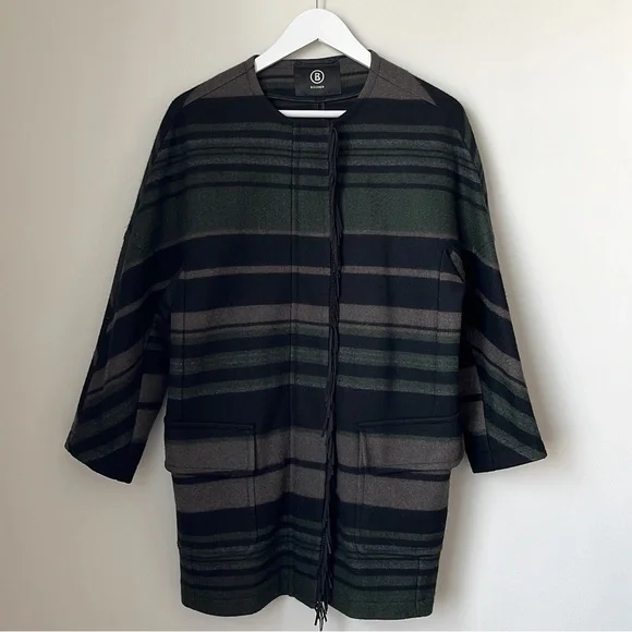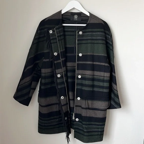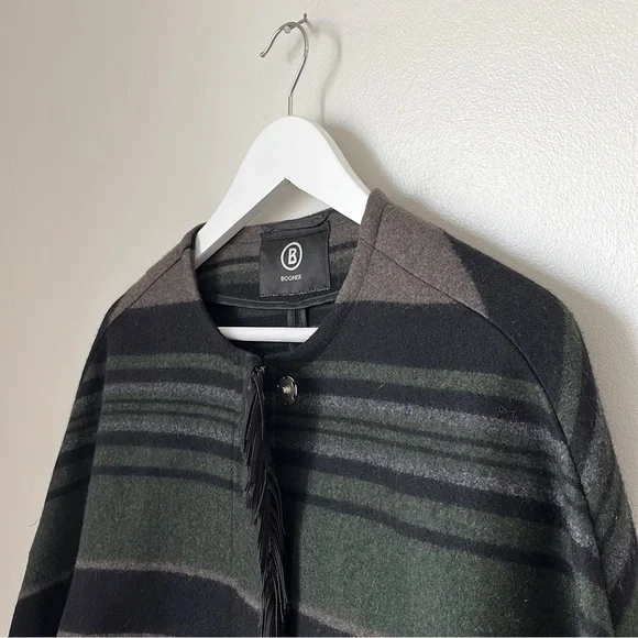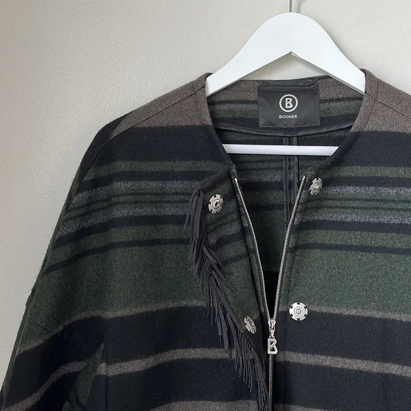 Bogner wool and cashmere blend western/ southwestern style jacket in evergreen black and grey stripe. Drop shoulders, hidden zip panel lined with black fringe. Silver zip and buttons for closure. Side patch pockets with flap. Fringe detail on back31” length21” underarm to underarm Tagged size 12. Can fit size S-L depending on desired fit and garment worn underneath. Model is size M. See ‘sizing’ slide for more details.47% virgin wool/ 30% viscose/ 15% polyamid/ 8% cashmere. Excellent condition