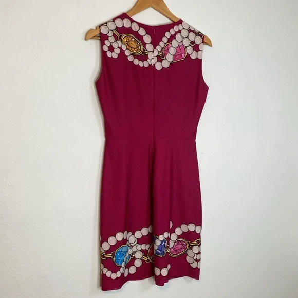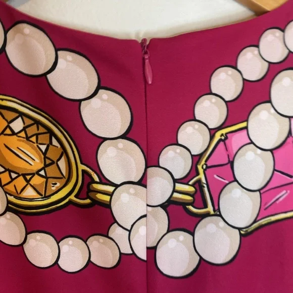 In excellent condition, this dress is truly a one-of-a-kind piece and incredibly hard to find these days. Featuring a classy print of jewels and pearls, this dress adds a touch of elegance and sophistication to any event. Perfect to wear with the matching jacket listed separately or style it alone for a chic casual look.Details:Size: 6 US / 40 EURMaterial: 89% Polyester, 11% Elastan-SpandexCondition: ExcellentMeasurements: Length: 33''Armpit: 17''Waist: 14''Don’t miss out on this rare find that’s sure to make a statement in your wardrobe!